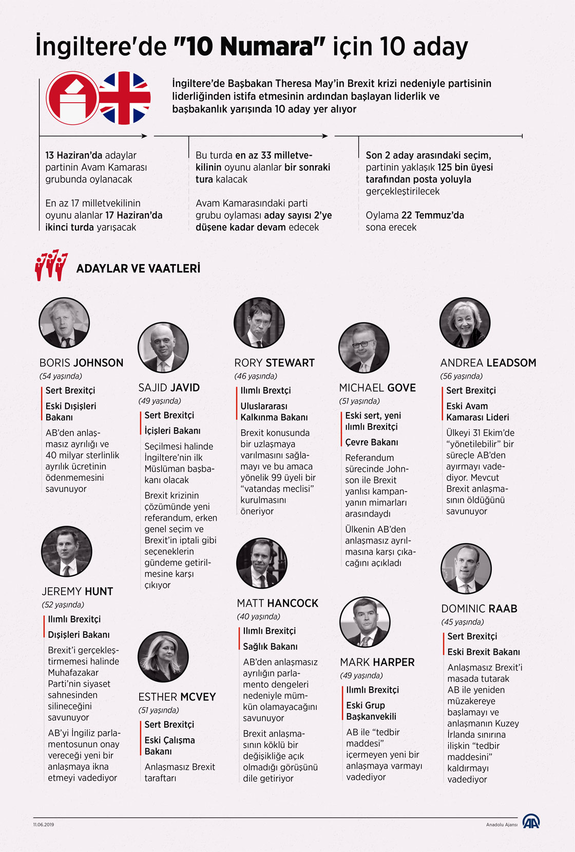 İngiltere’de Başbakan Theresa May’in Brexit krizi nedeniyle partisinin liderliğinden istifa etmesinin ardından başlayan liderlik ve başbakanlık yarışında 10 ismin adaylığı kesinleşirken adayların ana gündemini, Brexit sorunu belirliyor. ( Ahmet Burak Özkan - Anadolu Ajansı )11 Haziran 2019•Güncelleme: 11 Haziran 2019