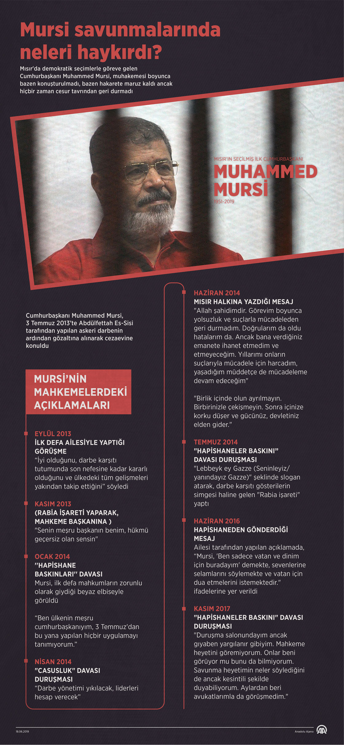 Mısır’da ilk defa 17 Haziran 2012 yılında yapılan demokratik seçimlerle cumhurbaşkanlığını kazandığı günün 8’inci yıl dönümünde darbeyle iktidara gelen hükümetin mahkeme salonunda hayatını kaybeden seçilmiş Cumhurbaşkanı Muhammed Mursi, muhakemesi boyunca bazen konuşturulmadı, bazen hakarete maruz kaldı ancak hiçbir zaman cesur tavrından geri durmadı. ( Yasin Demirci - Anadolu Ajansı )18 Haziran 2019•Güncelleme: 18 Haziran 2019