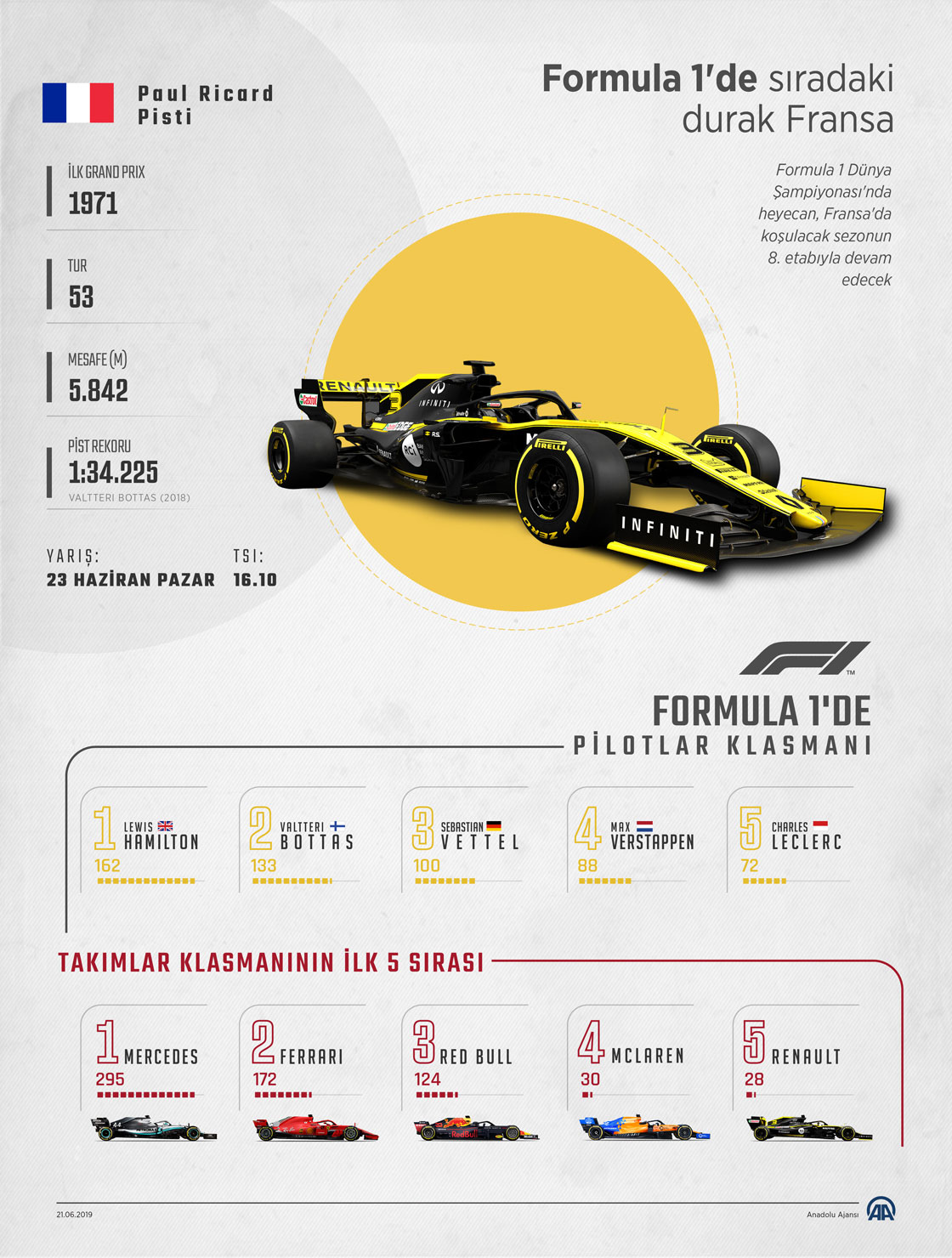 Formula 1 Dünya Şampiyonası'nda heyecan, Fransa'da koşulacak sezonun 8. etabıyla devam edecek. Fransa'nın Le Castellet kasabasındaki 5 bin 842 metrelik Paul Ricard Pisti'nde 53 tur üzerinden yapılacak yarışın sıralama turları yarın TSİ 16.00, yarış ise 23 Haziran Pazar günü 16.10'da başlayacak. ( Ahmet Burak Özkan - Anadolu Ajansı )21 Haziran 2019•Güncelleme: 21 Haziran 2019