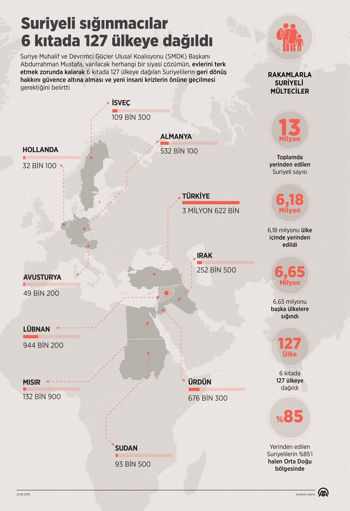 Suriye Muhalif ve Devrimci Güçler Ulusal Koalisyonu (SMDK) Başkanı Abdurrahman Mustafa, varılacak herhangi bir siyasi çözümün, evlerini terk etmek zorunda kalarak 6 kıtada 127 ülkeye dağılan Suriyelilerin geri dönüş hakkını güvence altına alması ve yeni insani krizlerin önüne geçilmesi gerektiğini belirtti. ( Mahmut Resul Karaca - Anadolu Ajansı )21 Haziran 2019•Güncelleme: 21 Haziran 2019