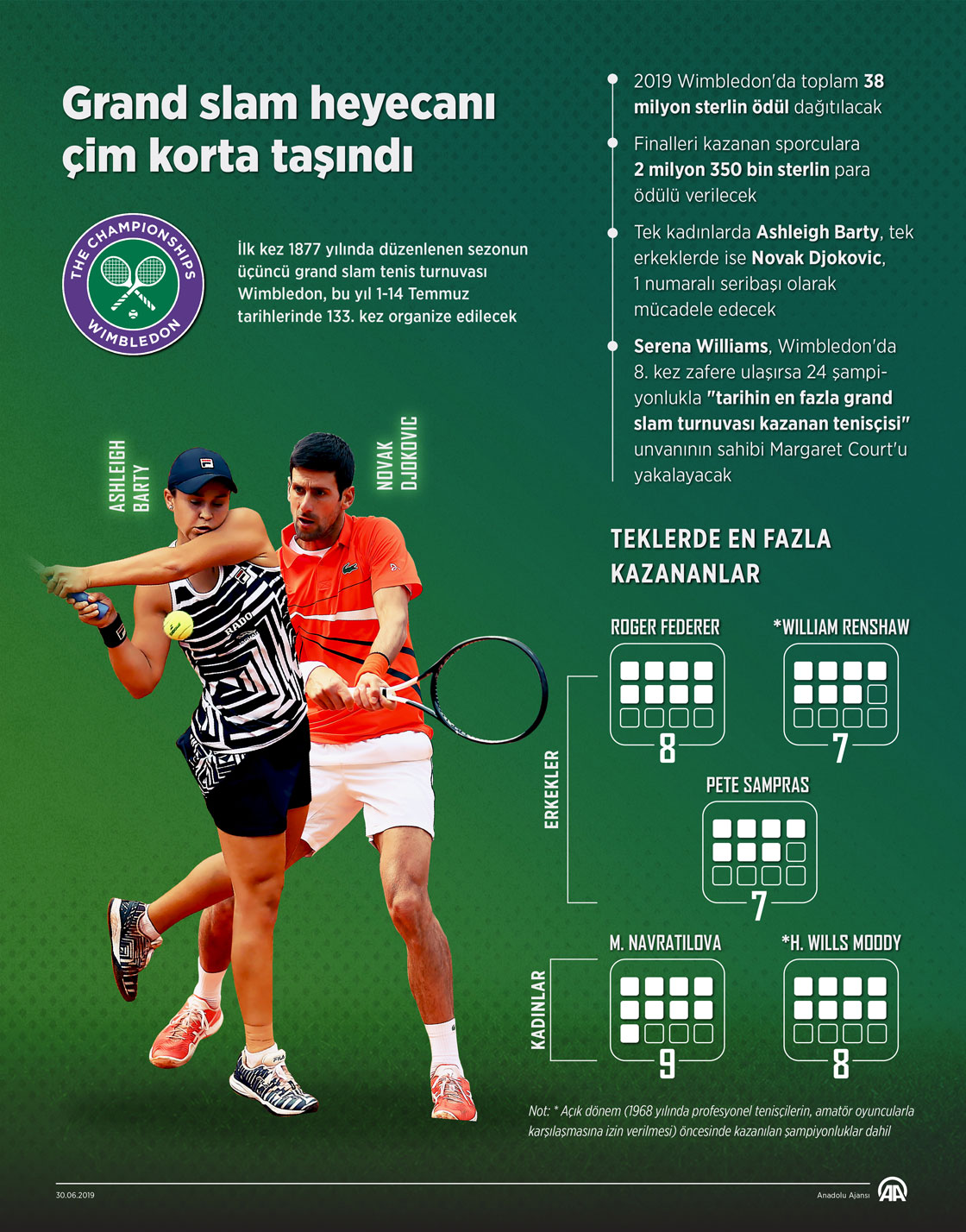 Çim kortta oynanan tek grand slam turnuvası olan Wimbledon'da bu yıl, tekler şampiyonlarına 2 milyon 350 bin sterlin para ödülü verilecek. Erkeklerde gözler, 8 şampiyonlukla elinde tuttuğu rekoru geliştirmeyi hedefleyen Federer, unvanını koruma peşindeki Djokovic ve 2010'dan bu yana ilk şampiyonluğunu isteyen Nadal'da olacak. ( Ahmet Burak Özkan - Anadolu Ajansı )30 Haziran 2019•Güncelleme: 30 Haziran 2019