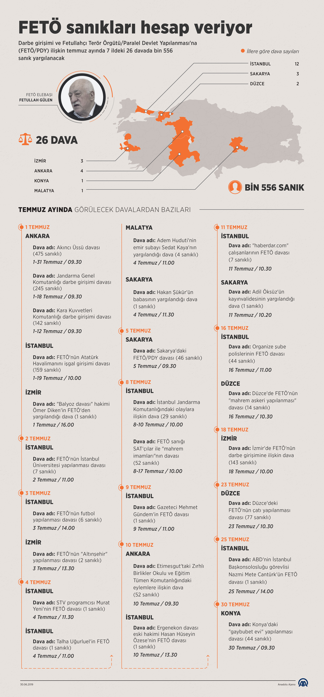 Darbe girişimi ve Fetullahçı Terör Örgütü/Paralel Devlet Yapılanması'na ilişkin temmuz ayında 7 ildeki 26 davada bin 556 sanık yargılanacak. (Murat Usubaliev - Anadolu Ajansı)