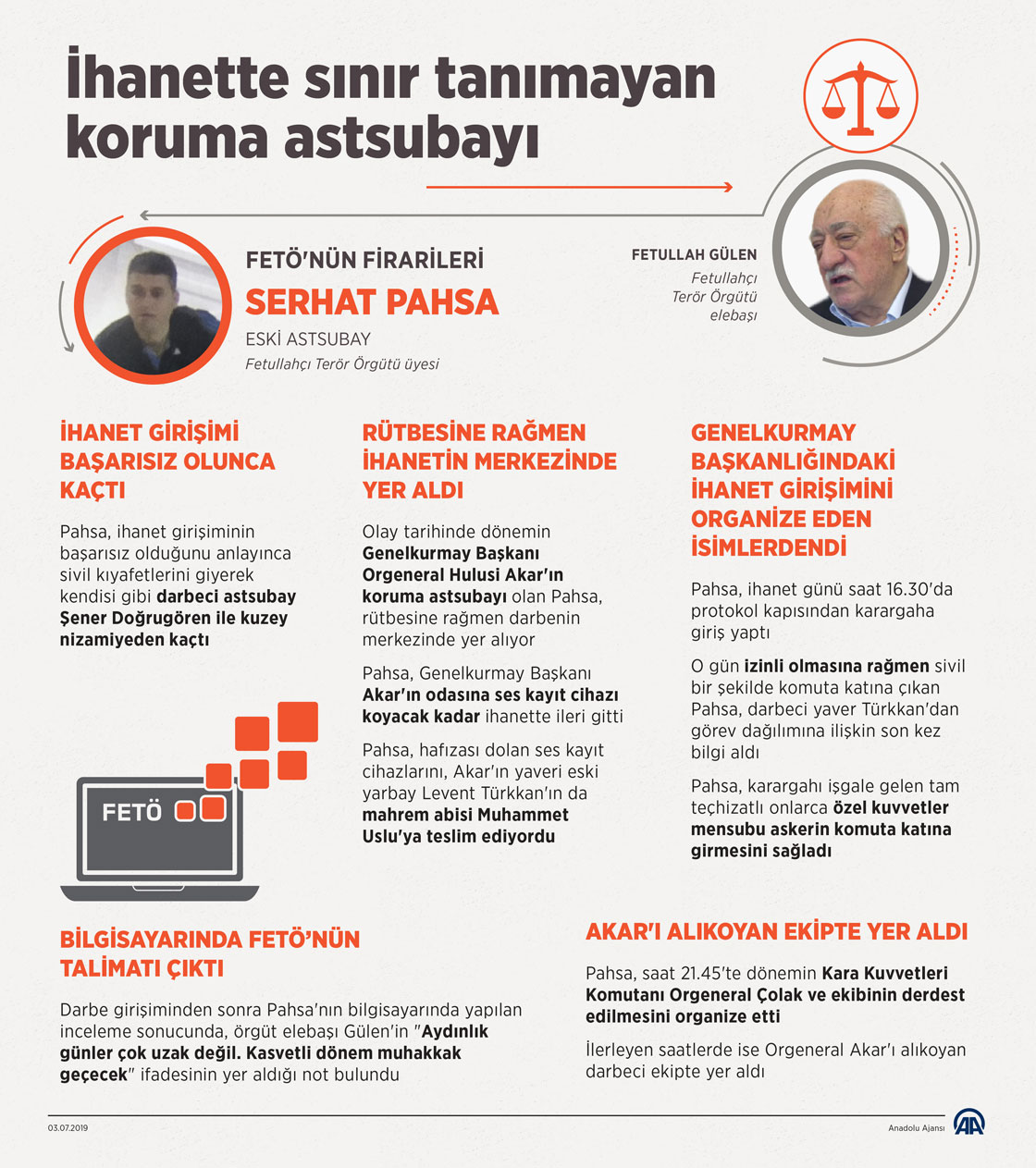 FETÖ'nün 15 Temmuz ihanet girişimi sırasında aktif rol oynayan, sivillerin şehit düşmesine ya da yaralanmasına neden olan darbecilerden bazıları, başarısız olduklarını anlayınca yurt dışına kaçtı. Dönemin Kara Kuvvetleri Komutanı Salih Zeki Çolak'ın alıkonulmasında yer alan ve Genelkurmay Başkanlığındaki ihanet girişimini organize eden isimlerden eski astsubay Serhat Pahsa, FETÖ'nün firarileri arasında yer alıyor. Örgüt içerisinde "Rauf" kod adını kullanan, Genelkurmay Başkanının odasına ses kayıt cihazı koyacak kadar ihanette ileri giden Pahsa, 15 Temmuz akşamı korumalığını yaptığı Hulusi Akar'ı alıkoyan ekipte de yer aldı. ( Murat Usubaliev - Anadolu Ajansı )03 Temmuz 2019•Güncelleme: 03 Temmuz 2019