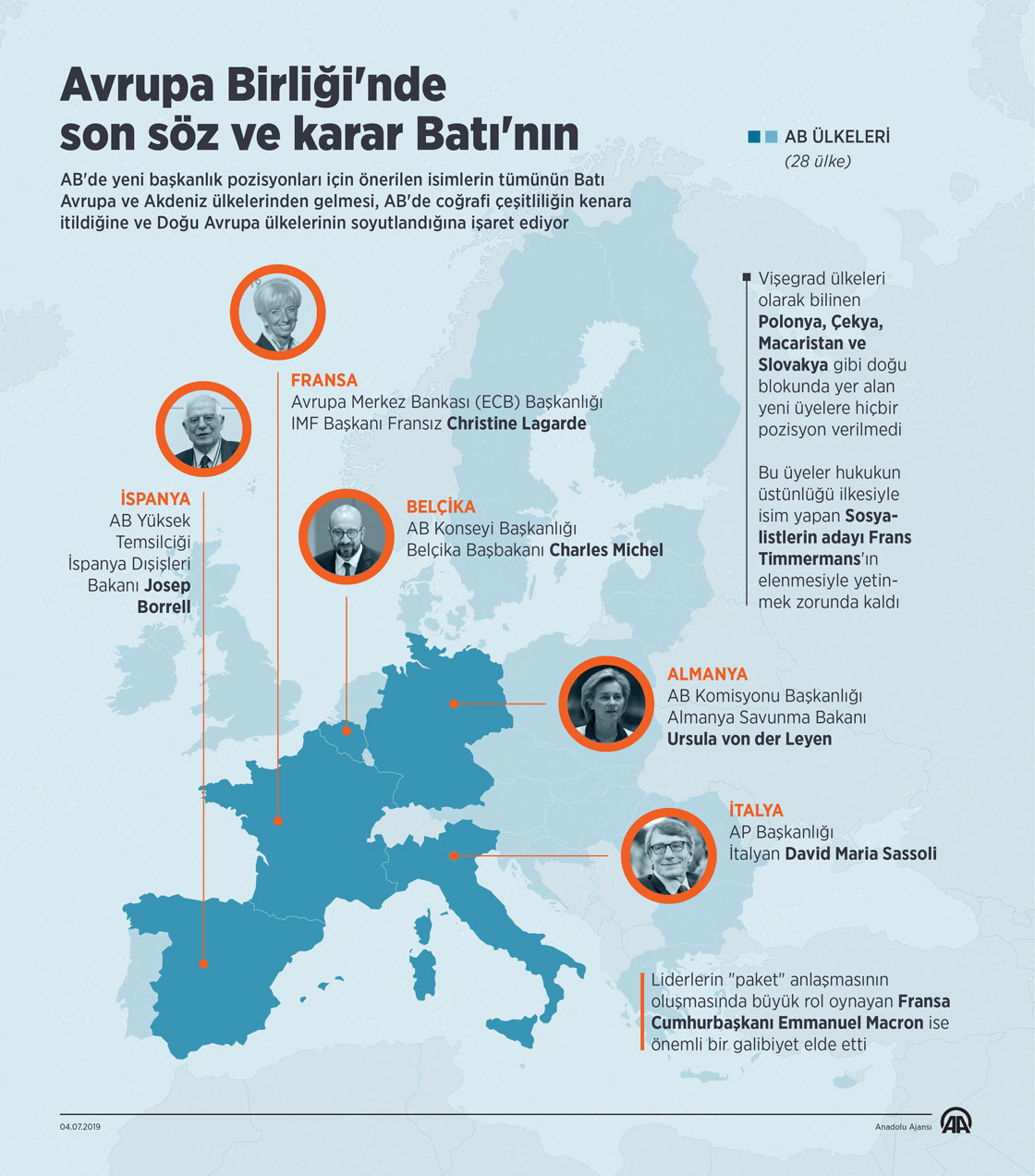 Avrupa Birliği'nin (AB) temel kurumlarının başkanlıklarına atanan isimlerin yoğunluklu Batı Avrupa ve Akdeniz ülkelerinden gelmesi, AB'de coğrafi çeşitliliğin ikinci plana atıldığına ve Doğu ile Batı bloku arasındaki ayrışmanın derinleştiğine işaret ediyor. ( Ahmet Burak Özkan - Anadolu Ajansı )04 Temmuz 2019•Güncelleme: 04 Temmuz 2019