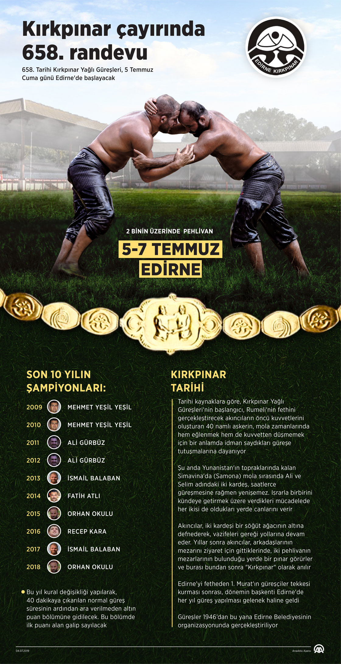 658. Tarihi Kırkpınar Yağlı Güreşleri, yarın Edirne'de başlayacak. Sarayiçi'ndeki Kırkpınar Er Meydanı'nda 2 binin üzerinde pehlivan, 658. buluşma için bir araya gelecek. ( Yasin Demirci - Anadolu Ajansı )