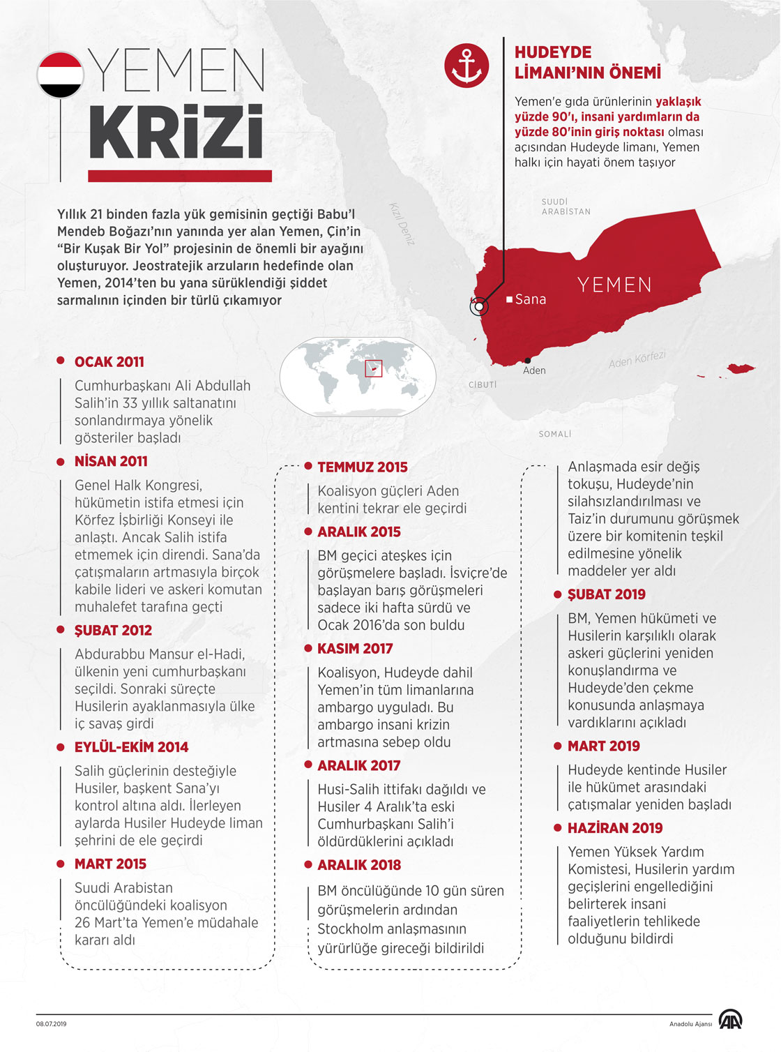 Yıllık 21 binden fazla yük gemisinin geçtiği Babu’l Mendeb Boğazı’nın yanında yer alan Yemen, Çin’in “Bir Kuşak Bir Yol” projesinin de önemli bir ayağını oluşturuyor. Jeostratejik arzuların hedefinde olan Yemen, 2014’ten bu yana sürüklendiği şiddet sarmalının içinden bir türlü çıkamıyor. ( Mevlüt Eren - Anadolu Ajansı )08 Temmuz 2019•Güncelleme: 08 Temmuz 2019