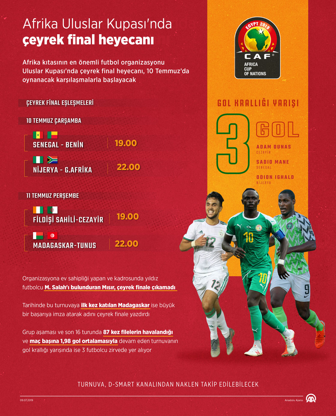 Afrika kıtasının en önemli futbol organizasyonu Uluslar Kupası'nda çeyrek final heyecanı, yarın oynanacak karşılaşmalarla başlayacak.
