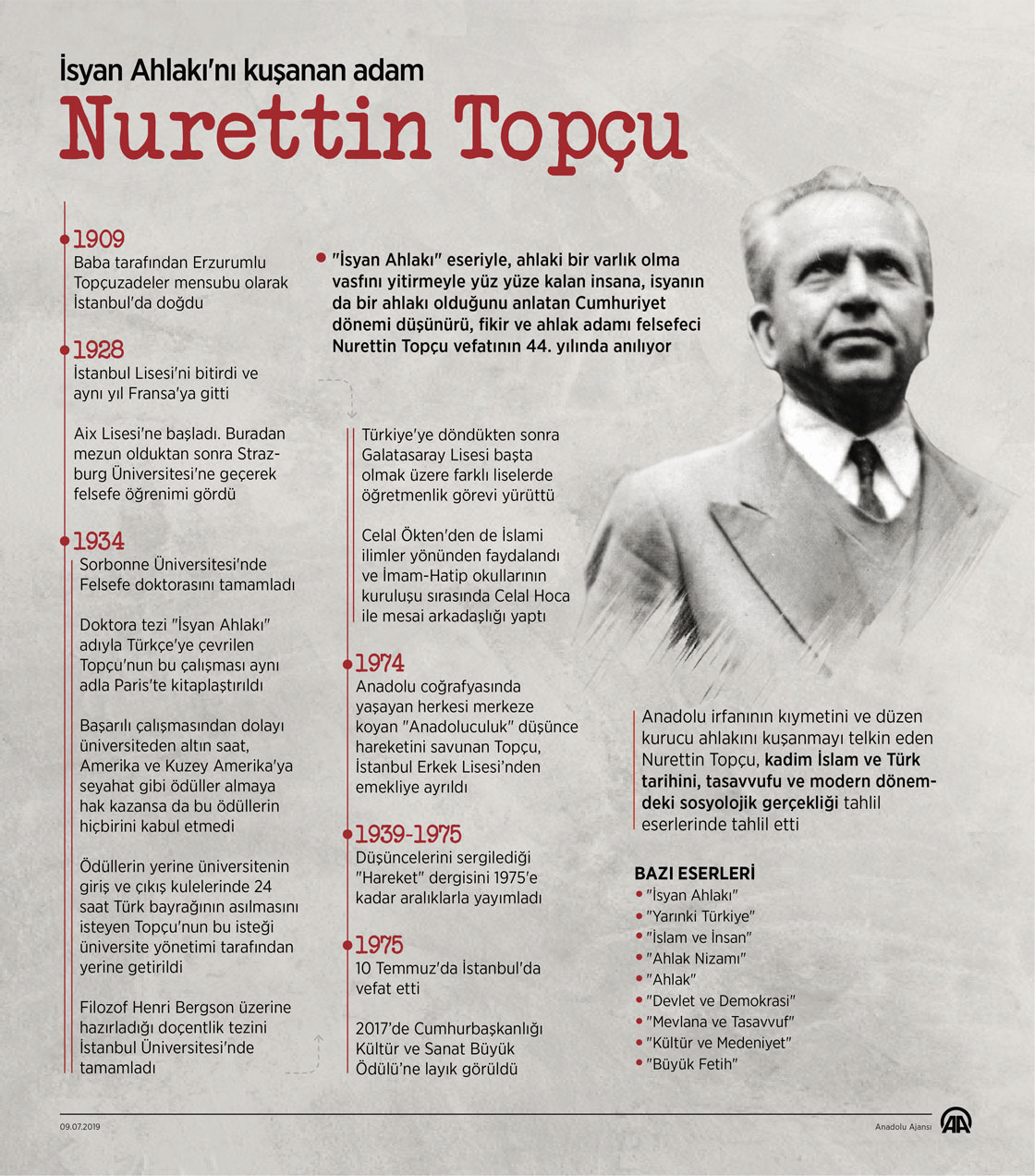 "İsyan Ahlakı" eseriyle, ahlaki bir varlık olma vasfını yitirmeyle yüz yüze kalan insana, isyanın da bir ahlakı olduğunu anlatan Cumhuriyet dönemi düşünürü, fikir ve ahlak adamı felsefeci Nurettin Topçu vefatının 44. yılında anılıyor. ( Ahmet Burak Özkan - Anadolu Ajansı )09 Temmuz 2019•Güncelleme: 09 Temmuz 2019