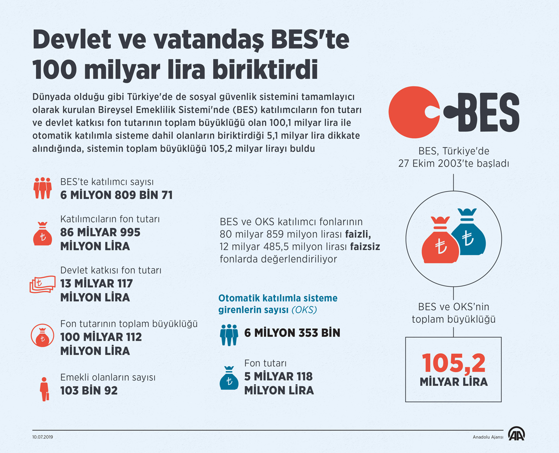 Dünyada olduğu gibi Türkiye'de de sosyal güvenlik sistemini tamamlayıcı olarak kurulan Bireysel Emeklilik Sistemi'nde (BES) katılımcıların fon tutarı ve devlet katkısı fon tutarının toplam büyüklüğü olan 100,1 milyar lira ile otomatik katılımla sisteme dahil olanların biriktirdiği 5,1 milyar lira dikkate alındığında, sistemin toplam büyüklüğü 105,2 milyar lirayı buldu. ( Murat Usubaliev - Anadolu Ajansı )10 Temmuz 2019•Güncelleme: 10 Temmuz 2019