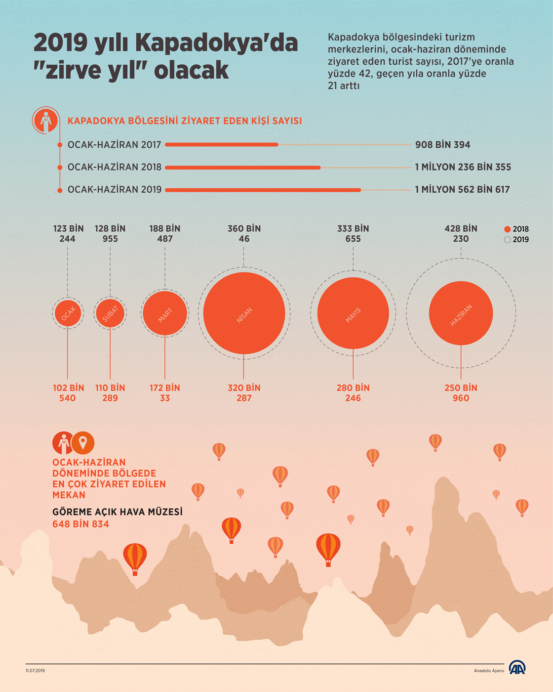 Türkiye'nin önemli turizm merkezlerinden Kapadokya bölgesini bu senenin ilk 6 aylık döneminde ziyaret edenlerin sayısı, "altın yıl" olarak kabul edilen 2018'e oranla yaklaşık yüzde 21 artarak 1 milyon 562 bin 617 kişiye yükseldi.
