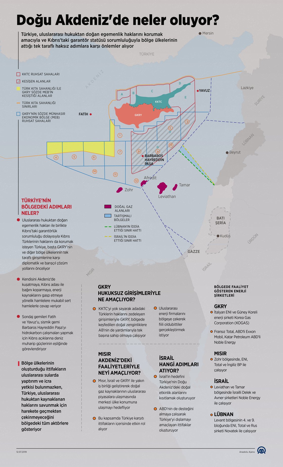 İsrail, Mısır, Güney Kıbrıs Rum Yönetimi (GKRY), Yunanistan, Lübnan, Suriye ve Libya son dönemde Akdeniz'in doğusunda gerçekleştirdikleri enerji merkezli faaliyetlerle tansiyonun yükselmesine neden olacak adımlar atarken Türkiye, uluslararası hukuktan doğan egemenlik haklarını korumak amacıyla önlemler alıyor. (Anadolu Ajansı - Ahmet Burak Özkan)12 Temmuz 2019•Güncelleme: 12 Temmuz 2019
