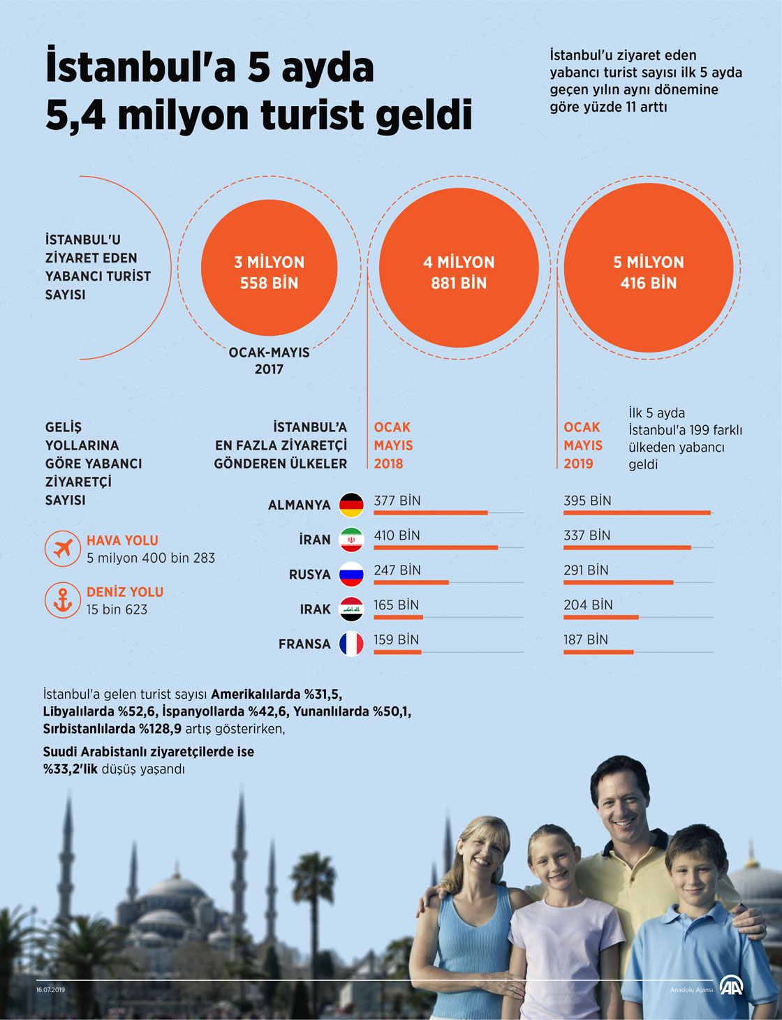 İstanbul'u ziyaret eden yabancı turist sayısı ilk 5 ayda geçen yılın aynı dönemine göre yüzde 11 artışla 5 milyon 416 bine yükselirken, bu alanda tarihi bir rekor kırıldı. ( Yasin Demirci - Anadolu Ajansı )