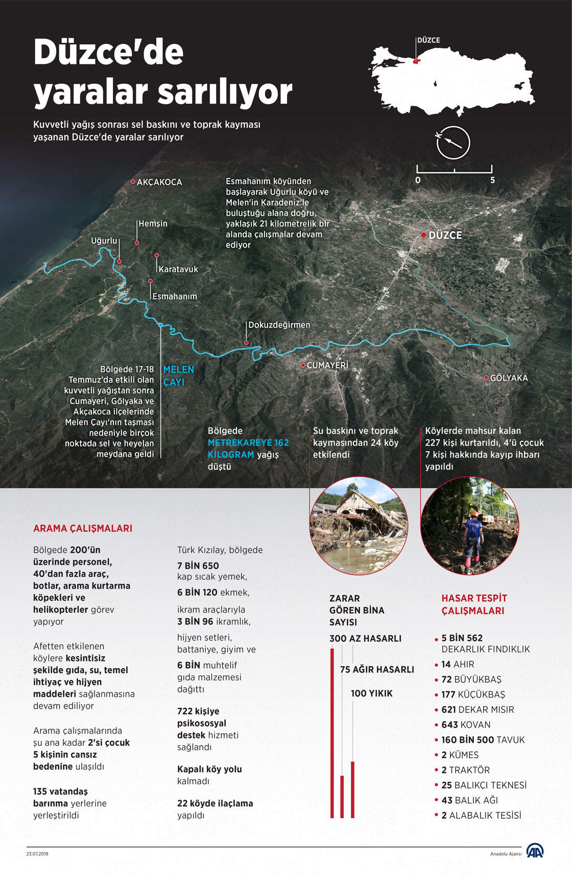 Kuvvetli yağış sonrası sel baskını ve toprak kayması yaşanan Düzce'de yaralar sarılıyor.
