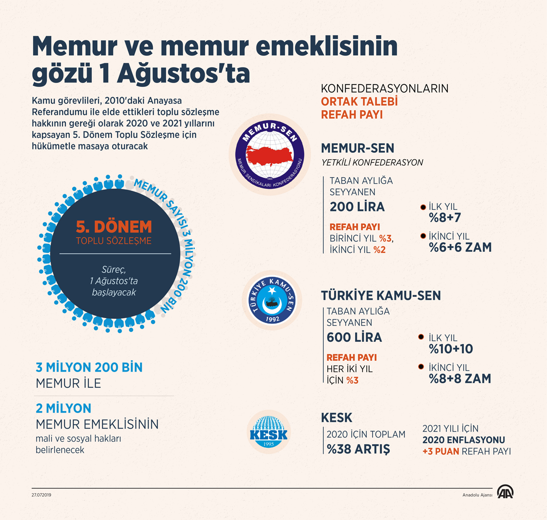 Kamu görevlileri, 2010'daki Anayasa Referandumu ile elde ettikleri toplu sözleşme hakkının gereği olarak 2020 ve 2021 yıllarını kapsayan 5. Dönem Toplu Sözleşme için hükümetle masaya oturacak. Yaklaşık 3 milyon 200 bin memur ile 2 milyon memur emeklisinin mali ve sosyal haklarının belirleneceği toplu sözleşme süreci, 1 Ağustos'ta başlayacak.27 Temmuz 2019•Güncelleme: 27 Temmuz 2019