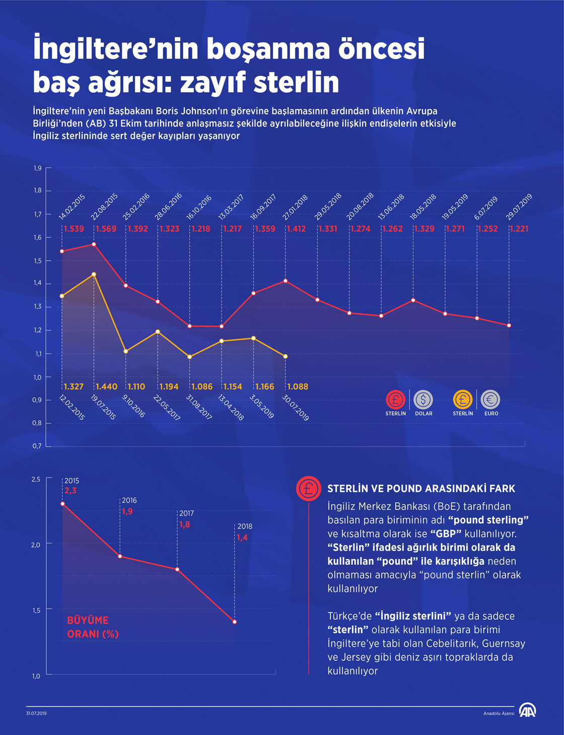 İngiltere’nin yeni Başbakanı Boris Johnson’ın görevine başlamasının ardından ülkenin Avrupa Birliği’nden (AB) 31 Ekim tarihinde anlaşmasız şekilde ayrılabileceğine ilişkin endişelerin etkisiyle İngiliz sterlininde sert değer kayıpları yaşanıyor. ( Yasin Demirci - Anadolu Ajansı )31 Temmuz 2019•Güncelleme: 31 Temmuz 2019