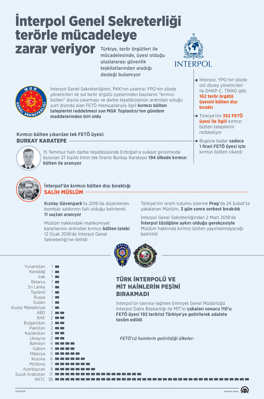 Terör örgütü PKK'nın Suriye uzantısı PYD/YPG'nin elebaşıları başta olmak üzere 162 teröristi kırmızı bültenden çıkarttığı ve 352 terörist hakkındaki bülten talebini çeşitli gerekçelerle reddettiği için son Milli Güvenlik Kurulunda eleştirilen İnterpol Genel Sekreterliği, bugüne kadar Türkiye'nin talebi doğrultusunda sadece bir Fetullahçı Terör Örgütü (FETÖ) üyesi için kırmızı bülten çıkardı. ( Murat Usubaliev - Anadolu Ajansı )01 Ağustos 2019•Güncelleme: 01 Ağustos 2019
