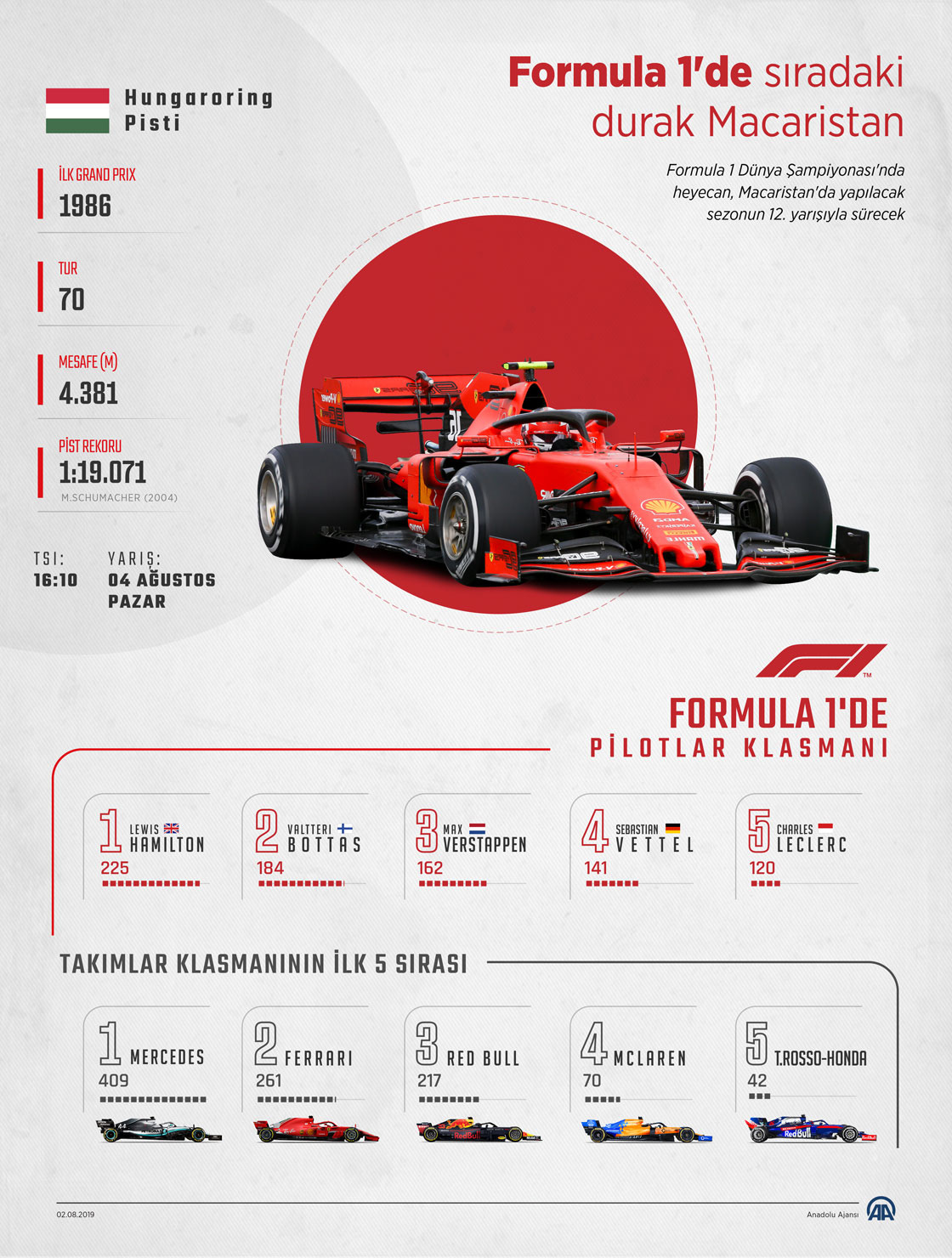 Formula 1 Dünya Şampiyonası'nda heyecan, Macaristan'da yapılacak sezonun 12. yarışıyla sürecek. Macaristan'ın başkenti Budapeşte'deki 4 bin 381 metrelik Hungaroring Pisti'nde 70 tur üzerinden gerçekleştirilecek yarışın sıralama turları yarın TSİ 16.00'da başlayacak. Yarış ise 4 Ağustos Pazar günü TSİ 16.10'da koşulacak. ( Kemal Delikmen - Anadolu Ajansı )02 Ağustos 2019•Güncelleme: 02 Ağustos 2019