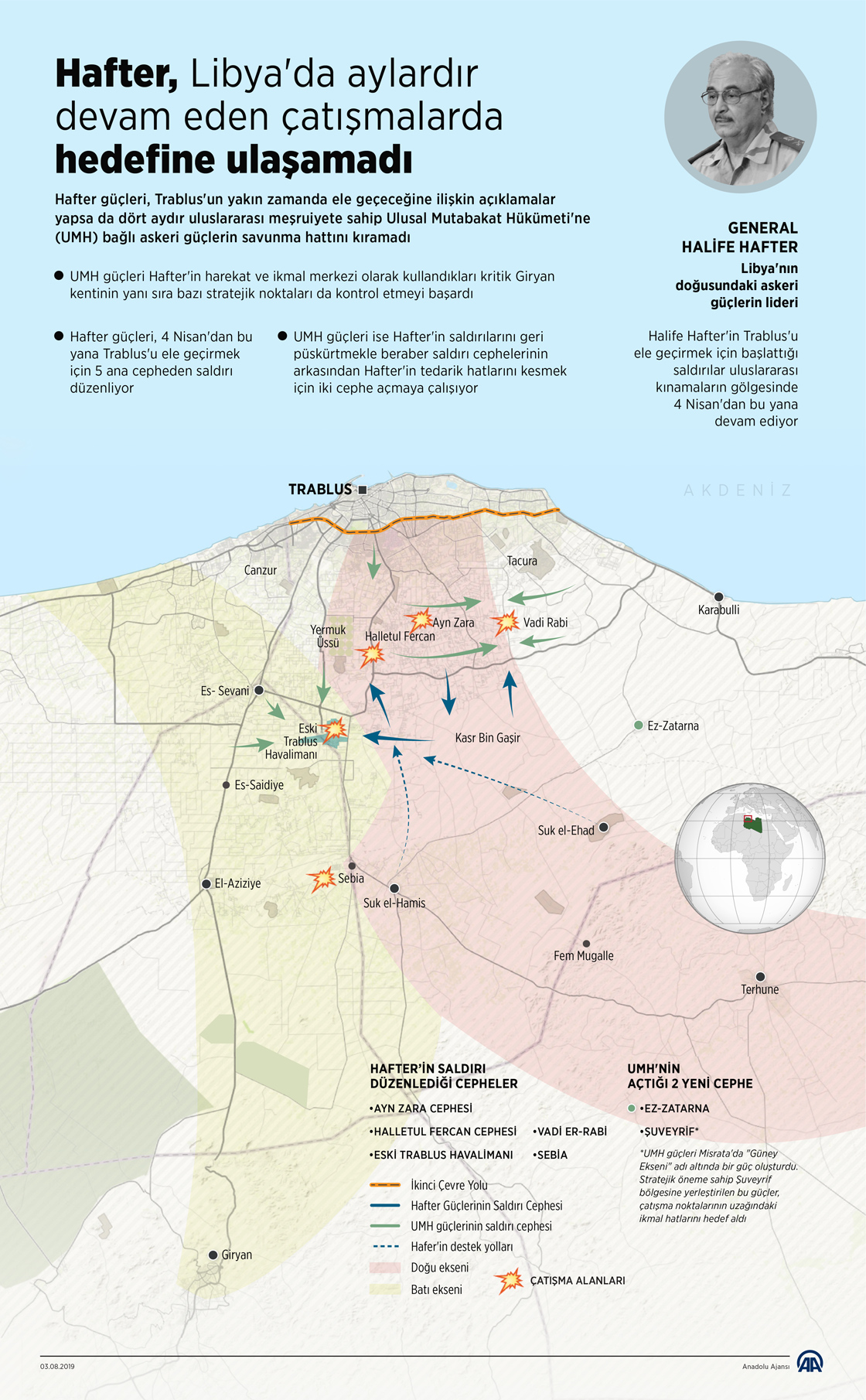 Libya'nın doğusundaki askeri güçlerin lideri General Halife Hafter, başkent Trablus'u ele geçirmek için başlattığı saldırının üzerinden dört ay geçmesine rağmen kent merkezine girme hedefine ulaşamadı. Eski Trablus Havalimanı, Halletul Fercan-Salahaddin, Ayn Zara, Vadi er-Rabi, Zatarna, Sebia ve Şuveyrif bölgelerinde UMH güçleri ile Hafter'e bağlı güçler arasında vur-kaç taktiğine dayalı çatışmalar devam ediyor. 03 Ağustos 2019•Güncelleme: 03 Ağustos 2019