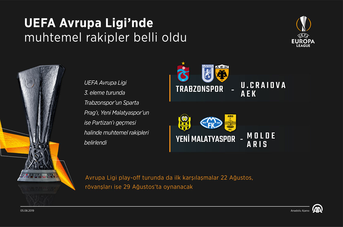UEFA Avrupa Ligi'nde grup maçları öncesi son eleme aşaması play-off turunun kuraları çekildi. İsviçre'nin Nyon kentindeki UEFA Genel Merkezi'nde gerçekleştirilen kura çekimi sonucu muhtemel play-off turu eşleşmeleri belli oldu. Buna göre 3. eleme turunu geçmesi halinde Trabzonspor, Universitatea Craiova (Romanya)-AEK (Yunanistan), Yeni Malatyaspor da Molde (Norveç)-Aris (Yunanistan) eşleşmesinin galibiyle karşılaşacak.