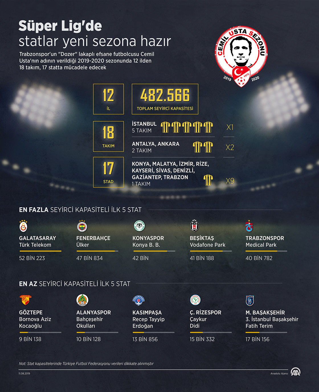 Türk futbolunun en üst seviye organizasyonu olan Süper Lig'de 62. sezonun başlamasına sayılı günler kalırken, müsabakaların oynanacağı statlar da hazır durumda. Ligin 2019-2020 sezonunda 18 takım, 17 statta mücadele edecek. Süper Lig maçlarının oynanacağı statlar arasında en fazla kapasiteye, 52 bin 223 kişiyle Türk Telekom Stadı sahip. En düşük kapasite ise İzmir'deki 9 bin 138 kişilik Bornova Aziz Kocaoğlu Stadı'nda. ( Ahmet Burak Özkan - Anadolu Ajansı )11 Ağustos 2019•Güncelleme: 11 Ağustos 2019