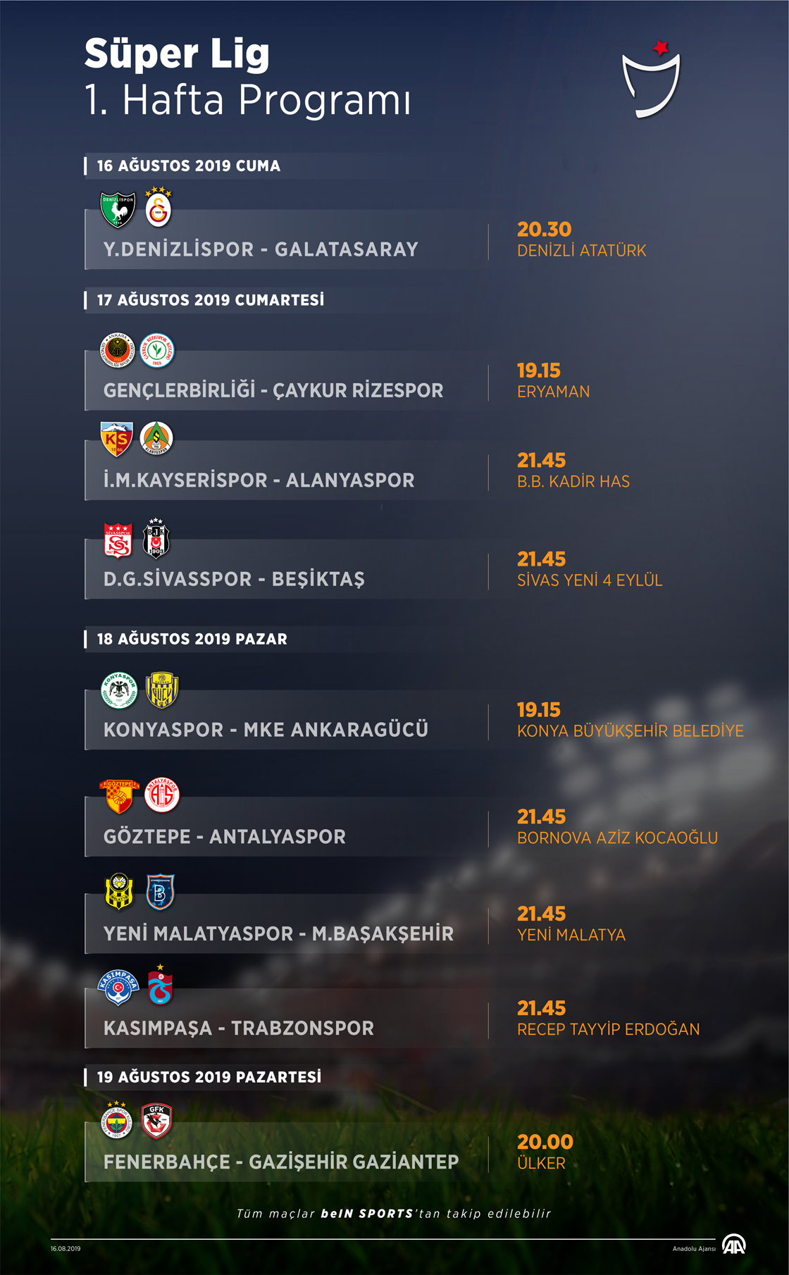 Süper Lig'in 1. haftasında ilk maç 16 Ağustos Cuma günü Yukatel Denizlispor ile Galatasaray arasında oynanacak.17 Ağustos Cumartesi 3, 18 Ağustos Pazar günü 4 maç ve 19 Ağustos Pazartesi günü ise tek maç oynanacak.
