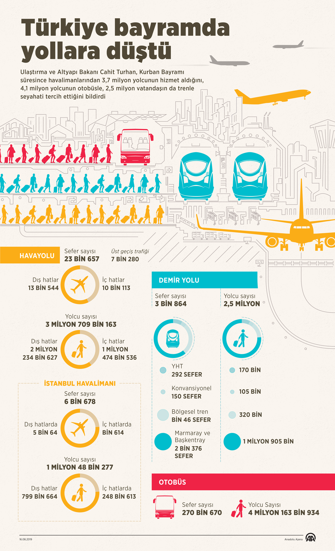 Ulaştırma ve Altyapı Bakanı Cahit Turhan, Kurban Bayramı süresince havalimanlarından 3,7 milyon yolcunun hizmet aldığını, 4,1 milyon yolcunun otobüsle, 2,5 milyon vatandaşın da trenle seyahati tercih ettiğini bildirdi.
