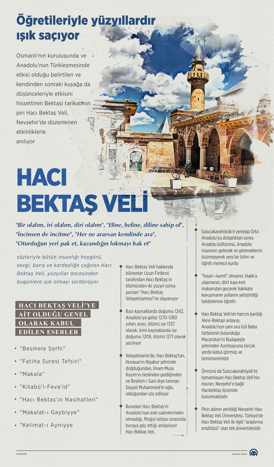 Öğretileriyle insanlığa hoşgörü, sevgi, barış ve kardeşlik mesajları veren Hacı Bektaş Veli, yüzyıllar öncesinden bugünlere ışık olmayı sürdürüyor.
