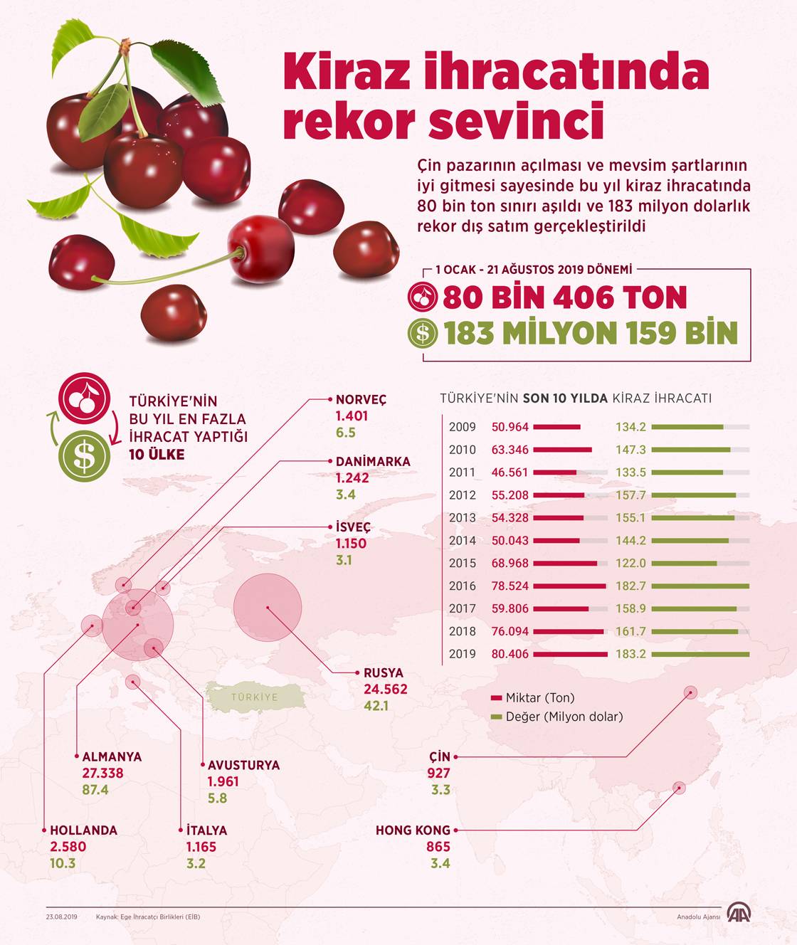Çin pazarının açılması ve mevsim şartlarının iyi gitmesi sayesinde bu yıl kiraz ihracatında 80 bin ton sınırı aşıldı ve 183 milyon dolarlık rekor dış satım gerçekleştirildi.