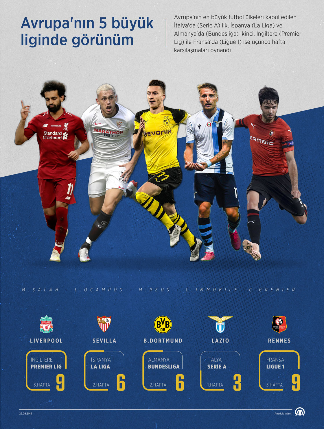 Avrupa'nın en büyük futbol ülkeleri kabul edilen İtalya'da (Serie A) ilk, İspanya (La Liga) ve Almanya'da (Bundesliga) ikinci, İngiltere (Premier Lig) ile Fransa'da (Ligue 1) ise üçüncü hafta karşılaşmaları oynandı ( Mahmut Resul Karaca - Anadolu Ajansı )26 Ağustos 2019•Güncelleme: 26 Ağustos 2019