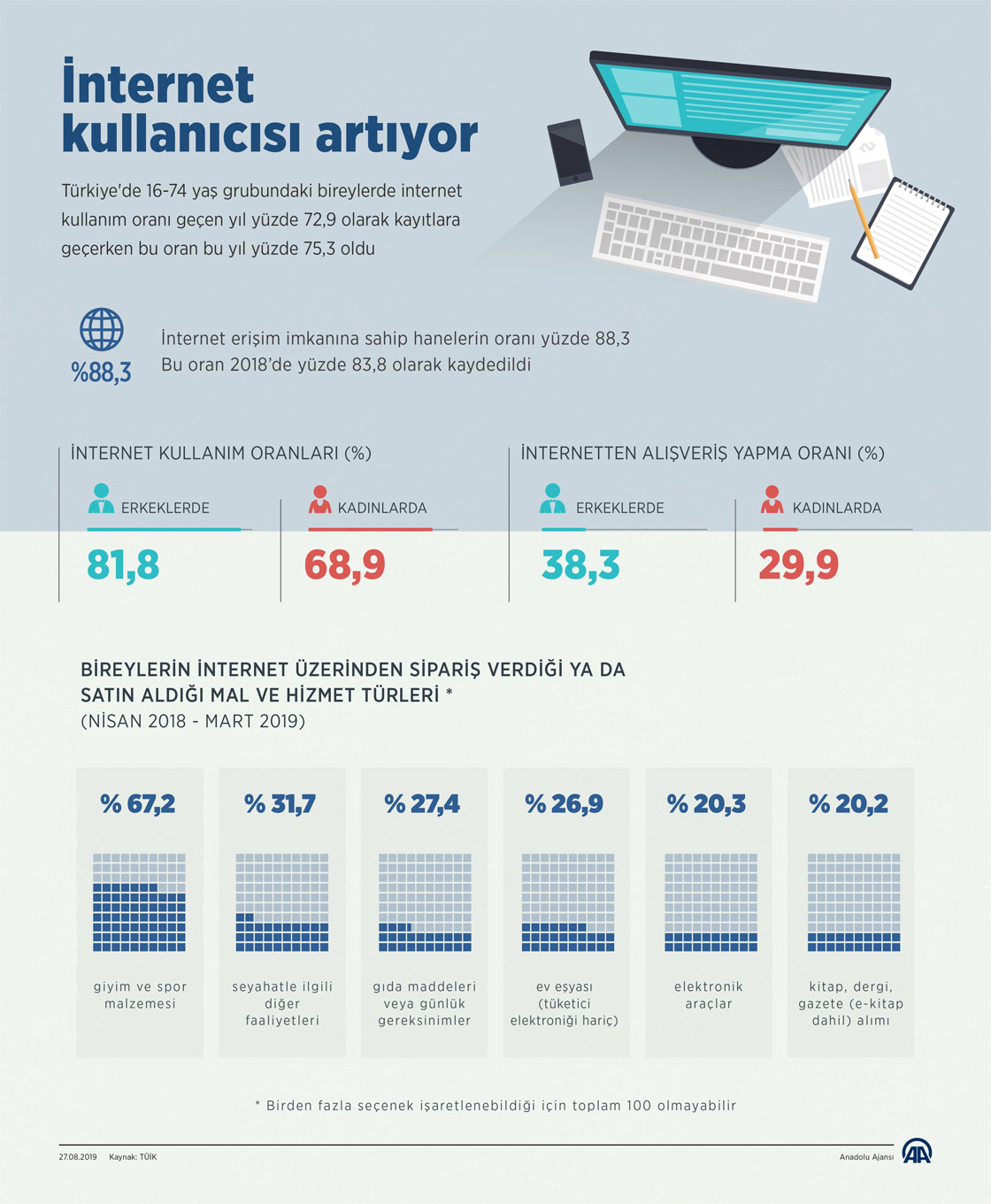 Türkiye'de bu yıl itibarıyla 16-74 yaş grubundaki kişilerin internet kullanım oranı yüzde 75,3 oldu. İnternetten alışveriş yapma oranı erkeklerde yüzde 38,3, kadınlarda yüzde 29,9 olarak kaydedildi.