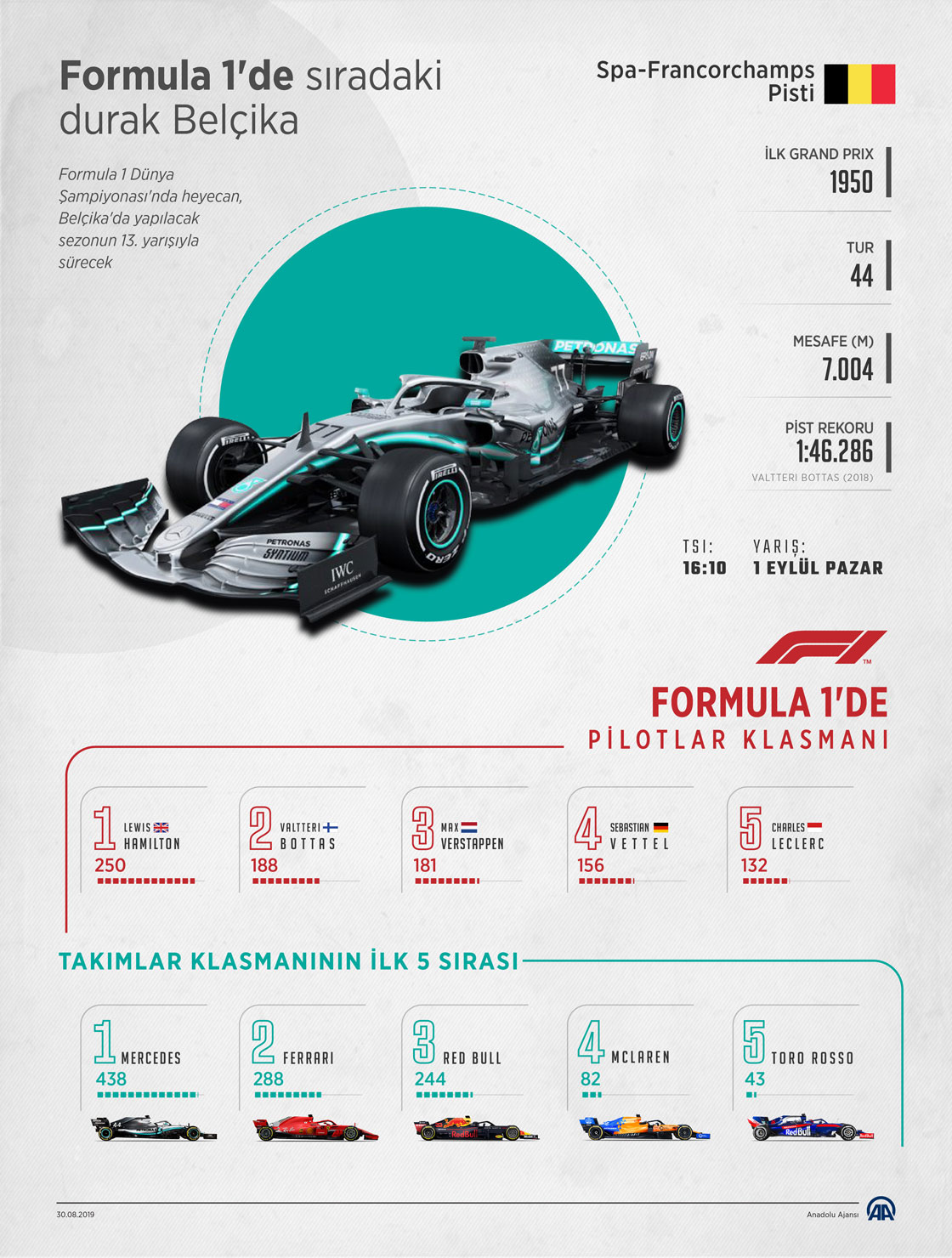 Formula 1 Dünya Şampiyonası'nda heyecan, Belçika'da yapılacak sezonun 13. yarışıyla sürecek. Yarışın sıralama turları 31 Ağustos Cumartesi TSİ 16.00'da başlayacak. Yarış ise 1 Eylül Pazar günü TSİ 16.10'da koşulacak. (Anadolu Ajansı - Ahmet Burak Özkan)30 Ağustos 2019•Güncelleme: 30 Ağustos 2019