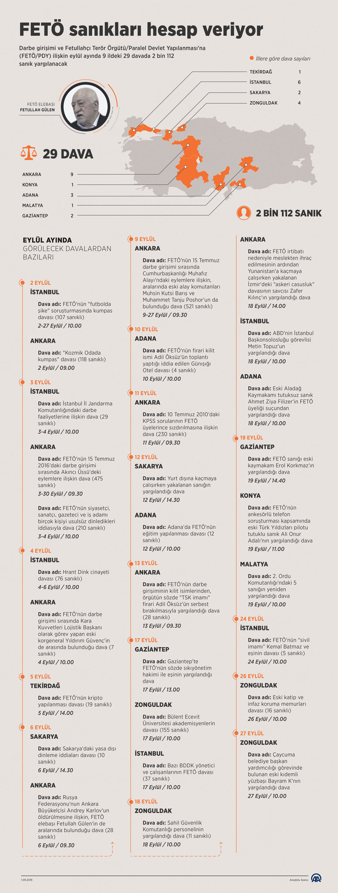 Darbe girişimi ve Fetullahçı Terör Örgütü/Paralel Devlet Yapılanması'na (FETÖ/PDY) ilişkin eylül ayında 9 ildeki 29 davada 2 bin 112 sanık yargılanacak.