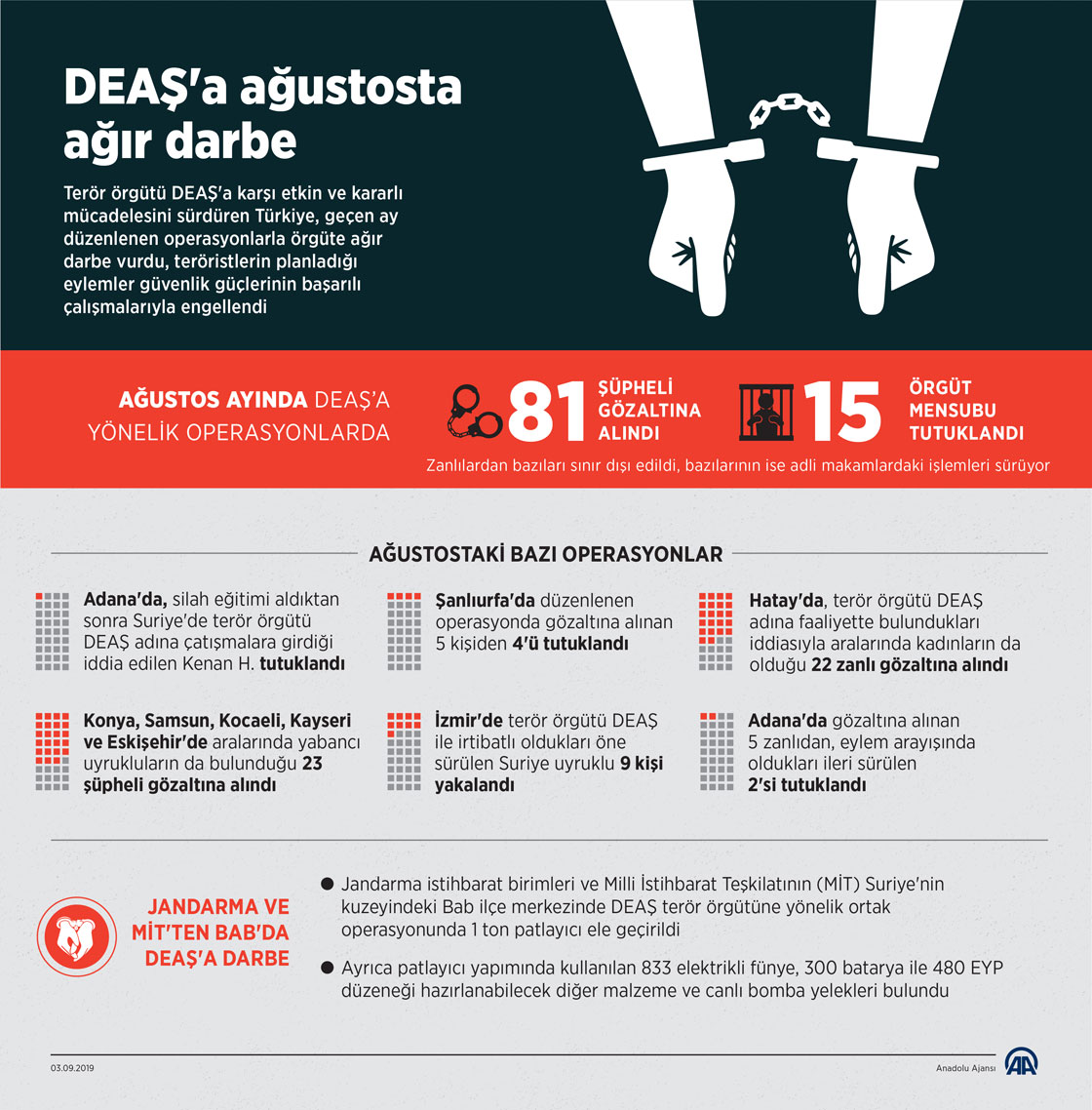 Terör örgütü DEAŞ'a yönelik etkin ve kararlı mücadelesini sürdüren güvenlik güçleri, geçen ay yurt genelindeki operasyonlarla örgüte darbe vurdu. ( Mahmut Resul Karaca - Anadolu Ajansı )
