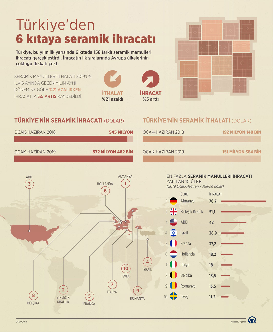 Türkiye, yılın ilk yarısında 6 kıtaya yaklaşık 572,5 milyon dolarlık seramik mamulleri ihracatı gerçekleştirdi. ( Muhammed Ali Yiğit - Anadolu Ajansı )