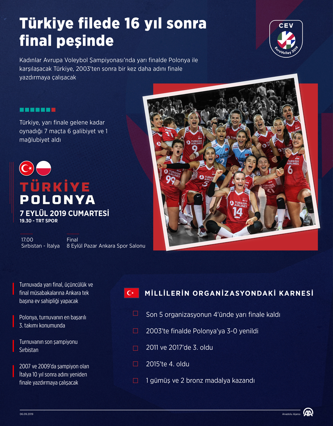 2019 Kadınlar Avrupa Voleybol Şampiyonası'nda finale yükselecek takımlar yarın belli olacak. Avrupa Voleybol Konfederasyonu (CEV) tarafından bu yıl 31. kez düzenlenen organizasyonda yarı final maçları yarın Ankara Spor Salonu'nda oynanacak.