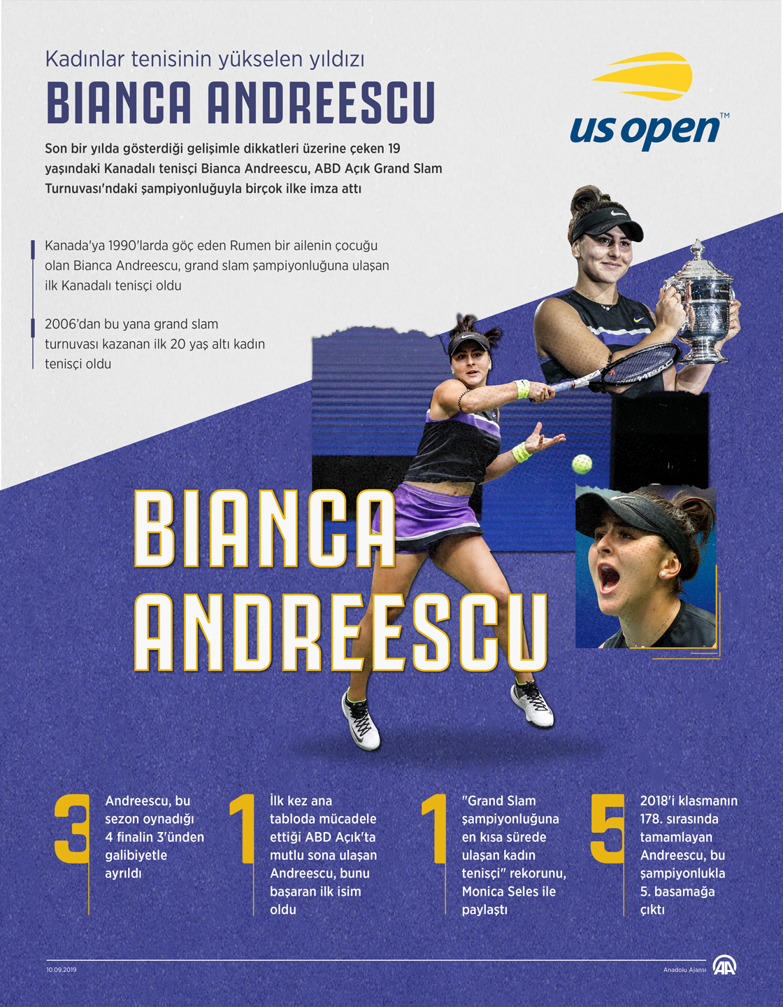 Son bir yılda gösterdiği gelişimle dikkatleri üzerine çeken 19 yaşındaki Kanadalı tenisçi Bianca Andreescu, ABD Açık Grand Slam Turnuvası'ndaki şampiyonluğuyla birçok ilke imza attı. Kanada'ya 1990'larda göç eden Rumen bir ailenin çocuğu olan Bianca Andreescu, bu yıl sergilediği performansla kadınlar tenisine yeni bir heyecan getirdi. 2019 öncesi WTA düzeyinde şampiyonluğu bulunmayan Andreescu, bu sezon oynadığı 4 finalin 3'ünden galibiyetle ayrıldı.