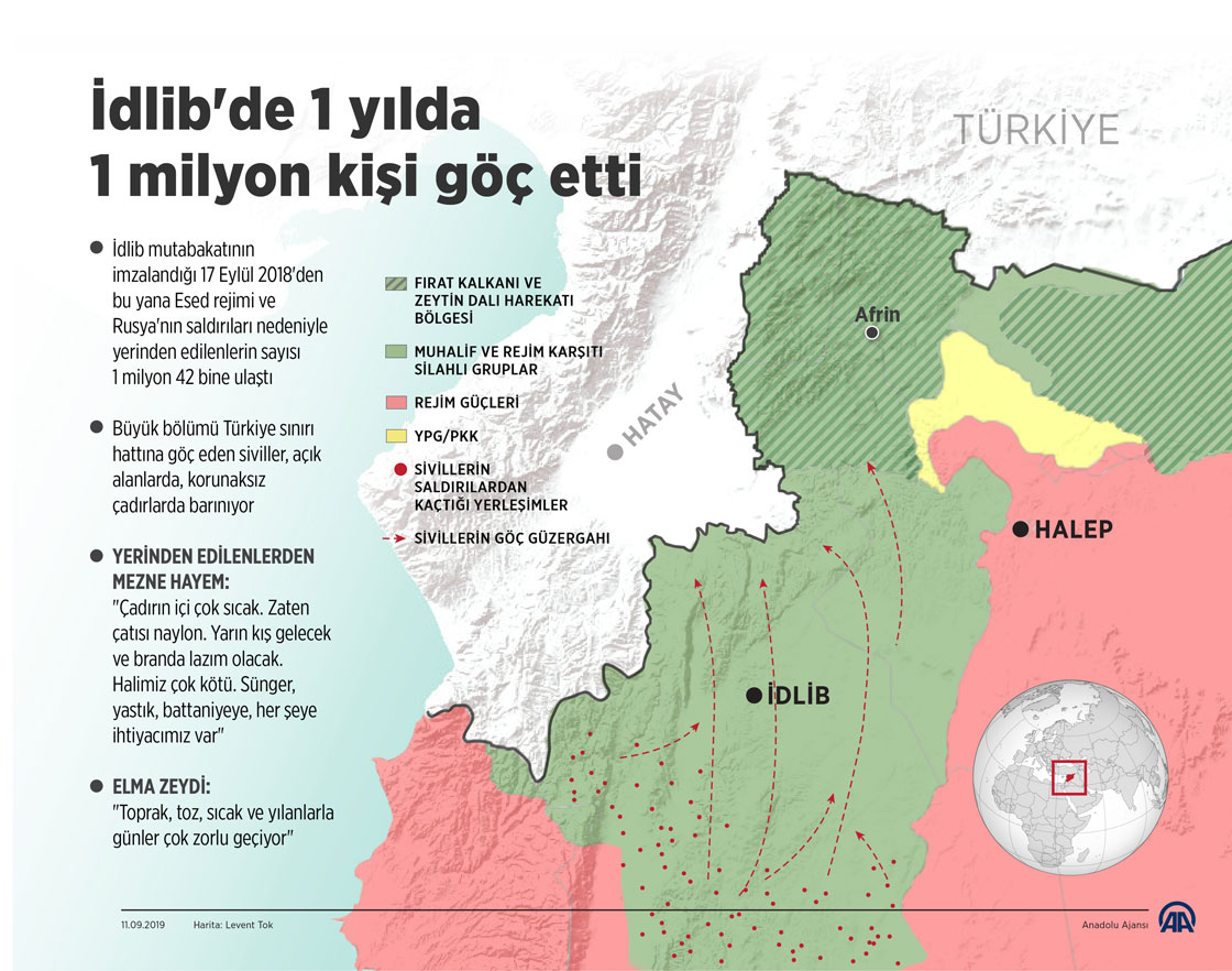 İdlib Gerginliği Azaltma Bölgesi'nde Beşşar Esed rejimi ve Rusya'nın saldırıları neticesinde 17 Eylül 2018'den bu yana 1 milyon 42 bin sivil yerinden edildi.