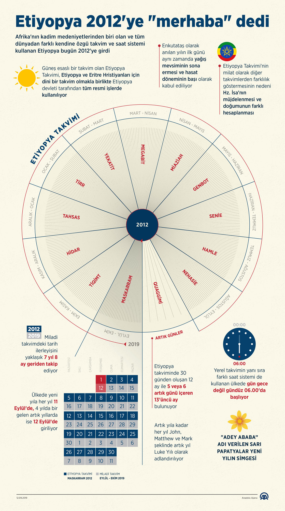 Afrika'nın kadim medeniyetlerinden biri olan ve tüm dünyadan farklı kendine özgü takvim ve saat sistemi kullanan Etiyopya bugün 2012'ye girdi. ( Yasin Demirci - Anadolu Ajansı )