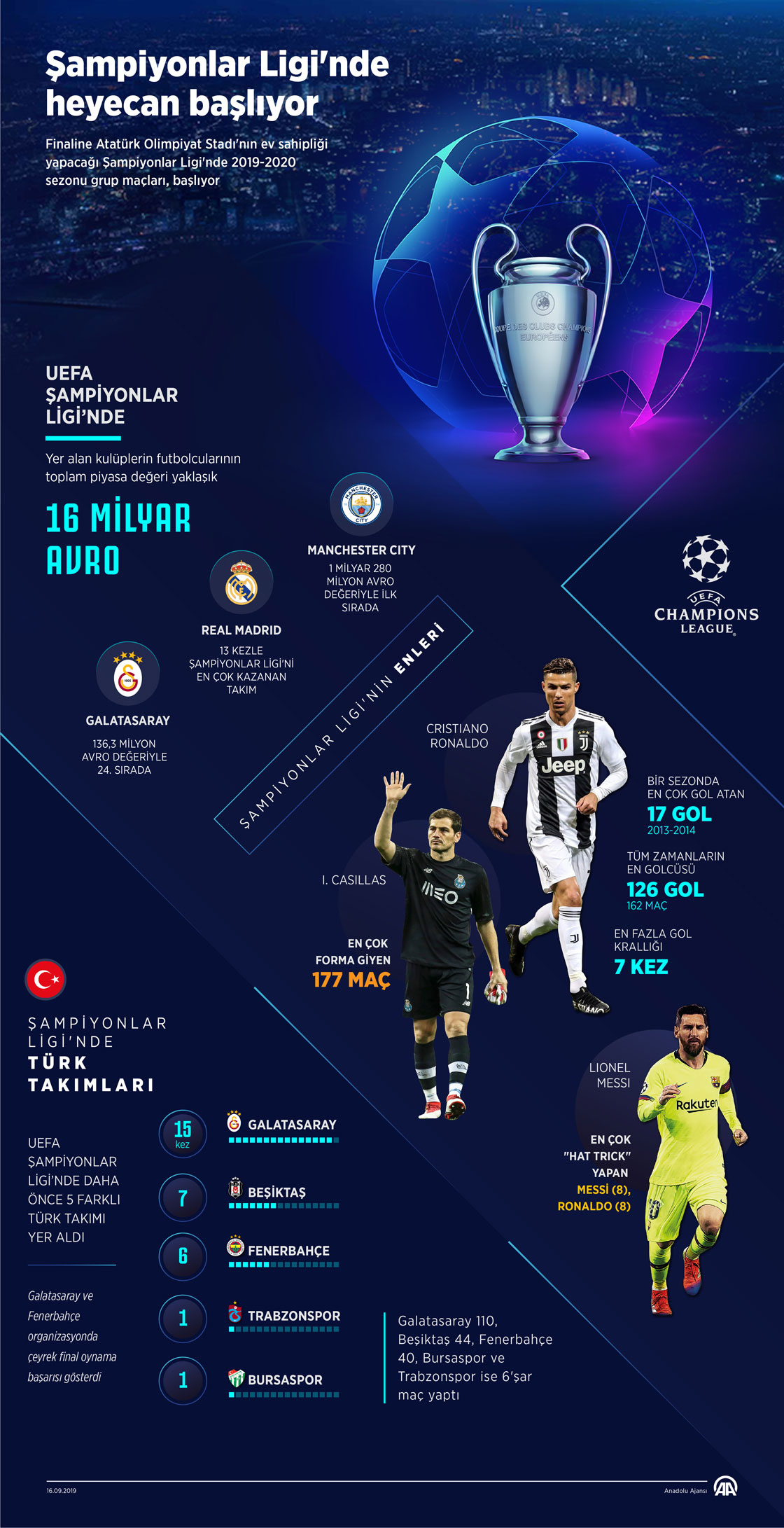 Finaline İstanbul'un ev sahipliği yapacağı Avrupa futbolunun kulüp düzeyindeki bir numaralı organizasyonu UEFA Şampiyonlar Ligi'nde 2019-2020 sezonu grup maçları heyecanı yarın başlıyor. ( Kemal Delikmen - Anadolu Ajansı )