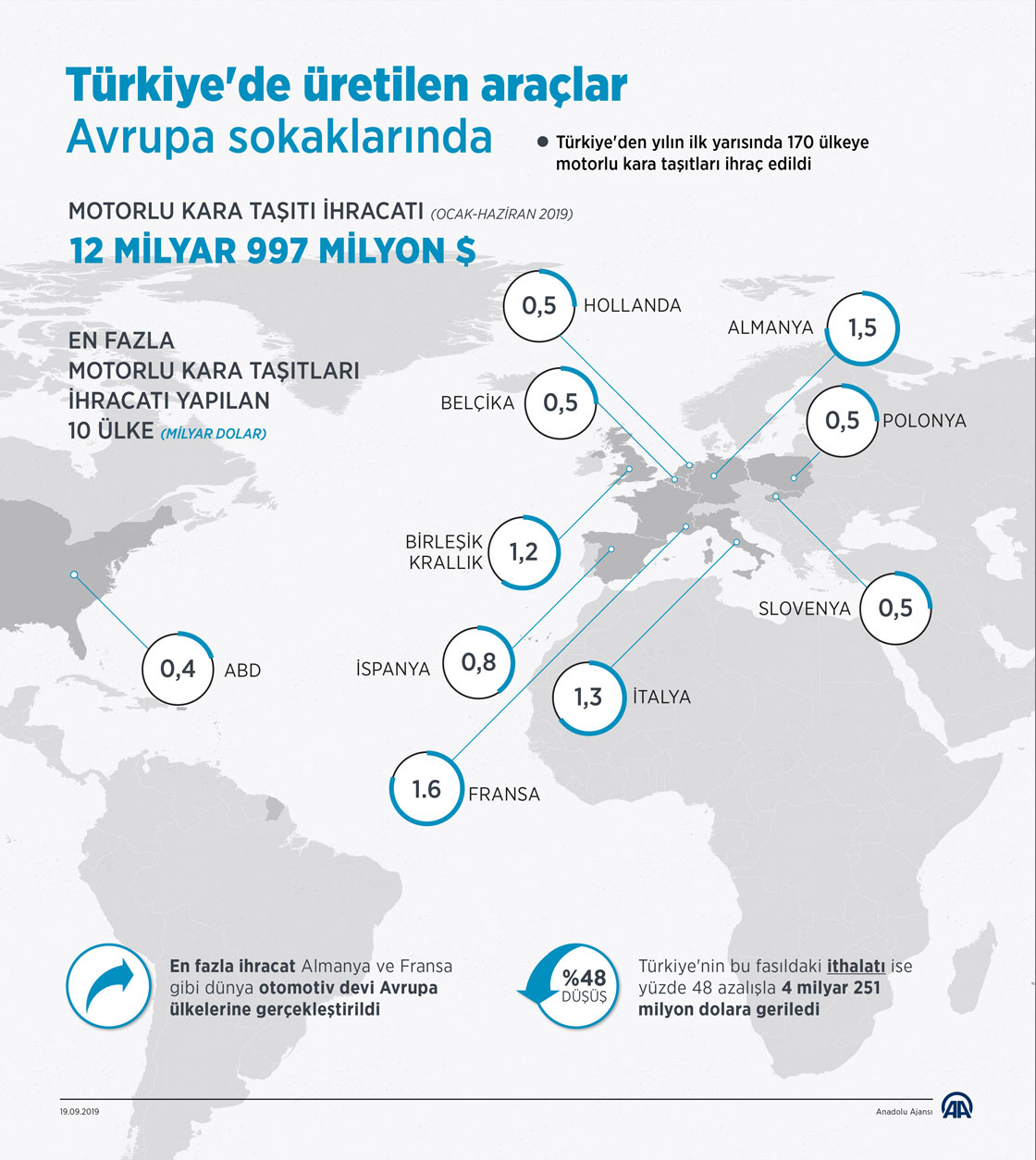 Otomobil firmalarının üretim üssü konumundaki Türkiye'den, ocak-haziran döneminde 170 ülkeye yaklaşık 13 milyar dolarlık motorlu kara taşıtı ihraç edilirken, dış satışlarda ilk sıraları sektörde önde gelen Avrupa ülkeleri aldı. ( Mahmut Resul Karaca - Anadolu Ajansı )19 Eylül 2019•Güncelleme: 19 Eylül 2019