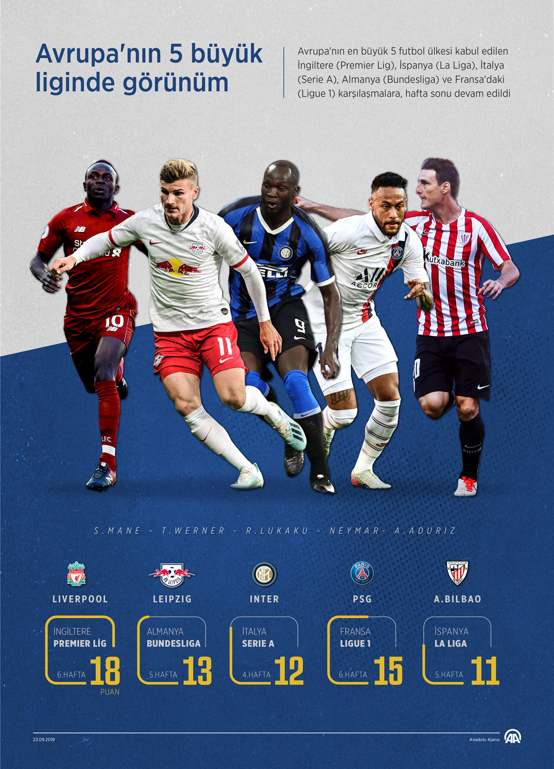 Avrupa'nın en büyük 5 futbol ülkesi kabul edilen İngiltere (Premier Lig), İspanya (La Liga), İtalya (Serie A), Almanya (Bundesliga) ve Fransa'daki (Ligue 1) karşılaşmalara, hafta sonu devam edildi. İngiltere'de Liverpool, İspanya'da Athletic Bilbao, İtalya'da Inter, Almanya'da Leipzig, Fransa'da ise Paris Saint-Germain (PSG), puan tablosunun zirvesinde yer aldı.
