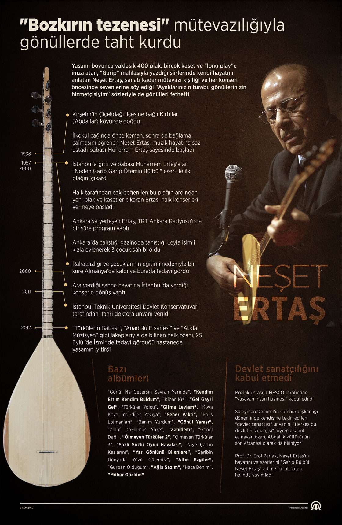Yaşamı boyunca yaklaşık 400 plak, birçok kaset ve "long play"e imza atan, "Garip" mahlasıyla yazdığı şiirlerinde kendi hayatını anlatan Neşet Ertaş, sanatı kadar mütevazı kişiliği ve her konseri öncesinde sevenlerine söylediği "Ayaklarınızın türabı, gönüllerinizin hizmetçisiyim" sözleriyle de gönülleri fethetti. ( Ahmet Burak Özkan - Anadolu Ajansı )24 Eylül 2019•Güncelleme: 24 Eylül 2019