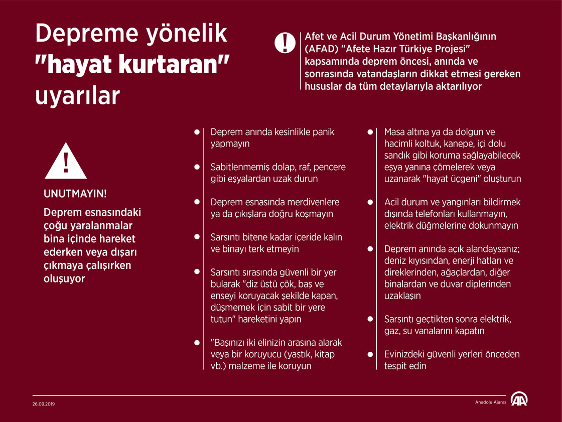 Afet ve Acil Durum Yönetimi Başkanlığının (AFAD) "Afete Hazır Türkiye Projesi" kapsamında deprem öncesi, anında ve sonrasında vatandaşların dikkat etmesi gereken hususlar da tüm detaylarıyla aktarılıyor. (Anadolu Ajansı - Mahmut Resul Karaca)