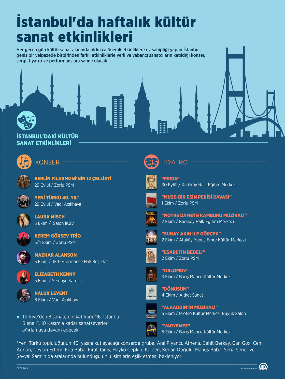 Her geçen gün kültür sanat alanında oldukça önemli etkinliklere ev sahipliği yapan İstanbul, geniş bir yelpazede birbirinden farklı etkinliklerle yerli ve yabancı sanatçıların katıldığı konser, sergi, tiyatro ve performanslara sahne olacak. ( Mahmut Resul Karaca - Anadolu Ajansı )29 Eylül 2019•Güncelleme: 29 Eylül 2019