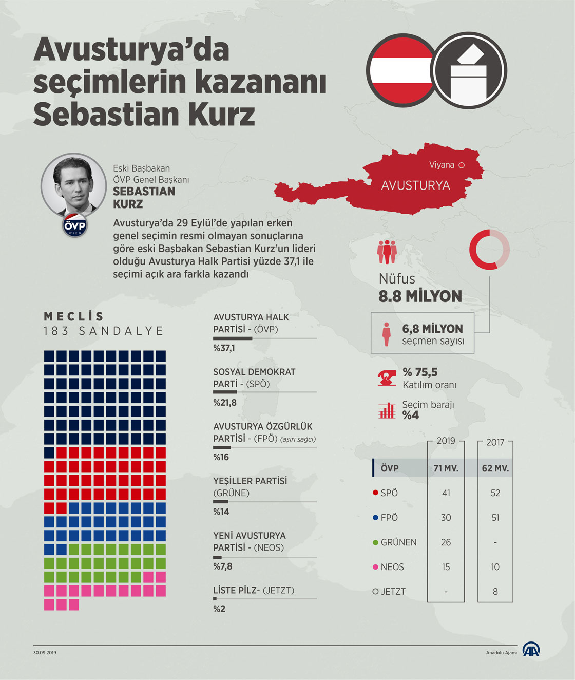 Avusturya'da erken genel seçimin sandık çıkış anketlerine göre, seçimi kazanan eski Başbakan Sebastian Kurz'un genel başkanlığını yürüttüğü Avusturya Halk Partisi (ÖVP) yüzde 37,1'lik oy oranıyla en yakın rakibine yaklaşık 15 puan fark attı. Yaklaşık 6,4 milyon seçmenin bulunduğu ülkede, seçmenlerin yüzde 75,5’i sandığa gitti.