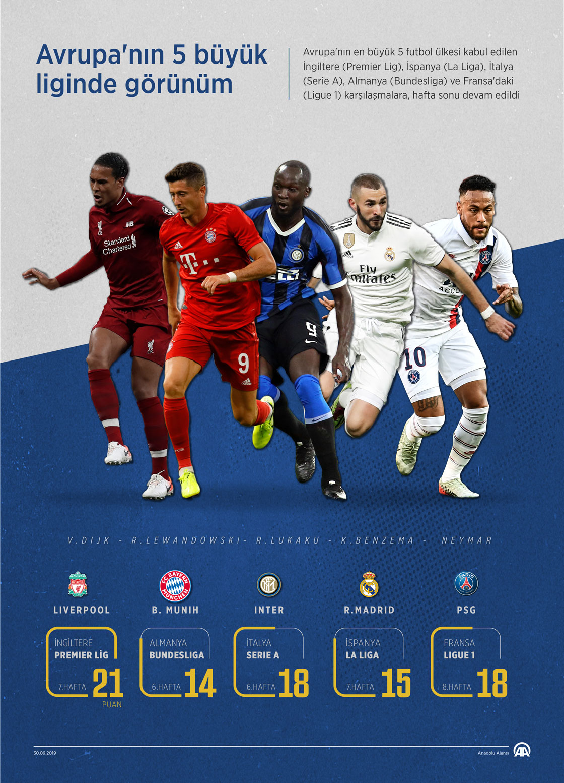 Avrupa'nın en büyük 5 futbol ligi kabul edilen İngiltere (Premier Lig), İspanya (La Liga), İtalya (Serie A), Almanya (Bundesliga) ve Fransa'daki (Ligue 1) karşılaşmalara, hafta sonu devam edildi. ( Mahmut Resul Karaca - Anadolu Ajansı )