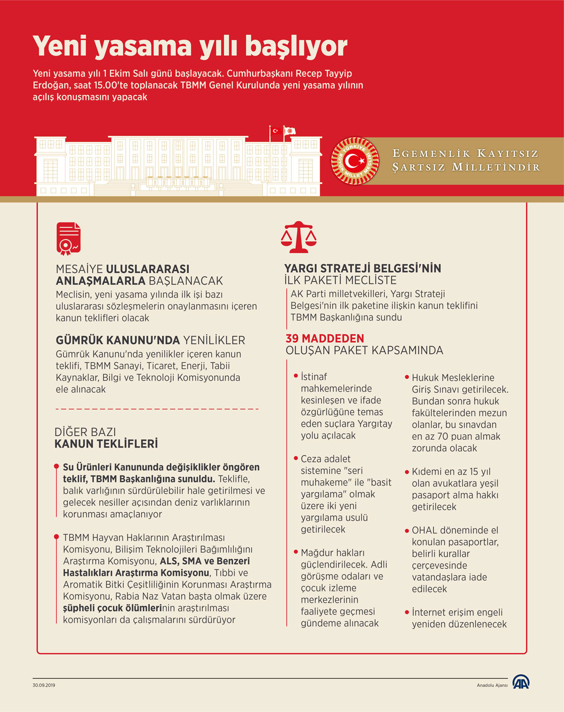 Meclis, 2,5 aylık tatilin ardından 1 Ekim Salı günü yasama çalışmalarına başlayacak. TBMM Genel Kurulunun 27. Dönem 3. Yasama Yılı'nda ilk işi bazı uluslararası sözleşmelerin onaylanmasını içeren kanun teklifleri olacak. ( Ahmet Burak Özkan - Anadolu Ajansı )