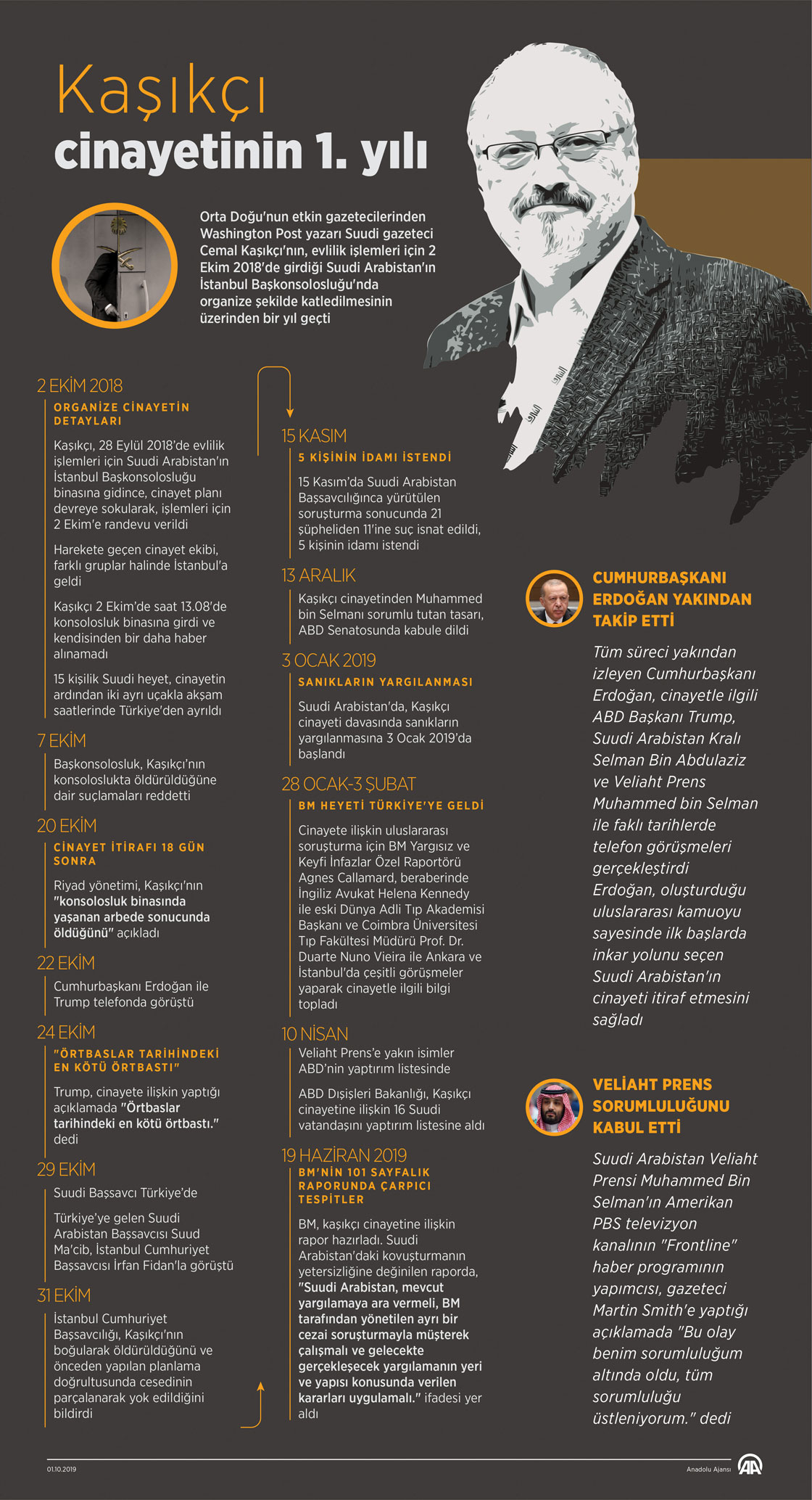 Orta Doğu'nun etkin gazetecilerinden Washington Post yazarı Suudi gazeteci Cemal Kaşıkçı'nın, evlilik işlemleri için 2 Ekim 2018'de girdiği Suudi Arabistan'ın İstanbul Başkonsolosluğunda organize şekilde katledilmesinin üzerinden bir yıl geçti. ( Muhammed Ali Yiğit - Anadolu Ajansı )01 Ekim 2019•Güncelleme: 01 Ekim 2019