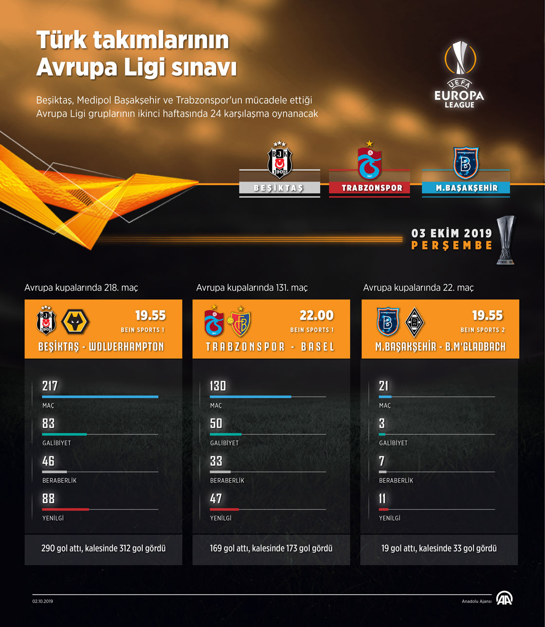Beşiktaş, Medipol Başakşehir ve Trabzonspor'un mücadele ettiği Avrupa Ligi gruplarının ikinci haftasında 24 karşılaşma oynanacak.
