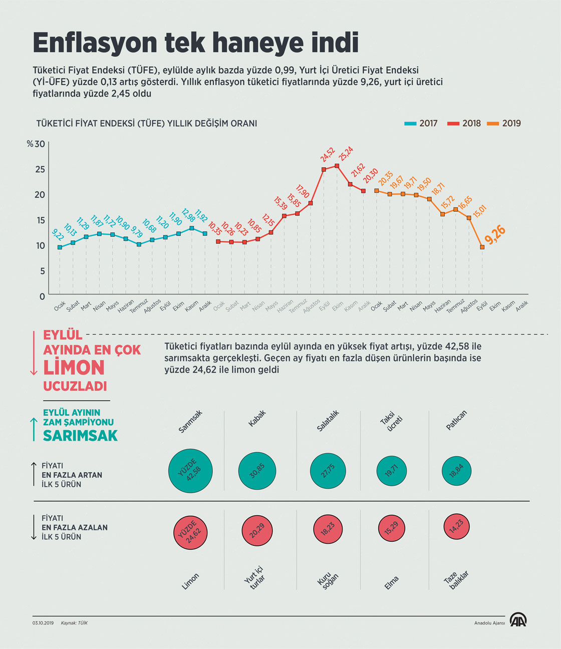 Tüketici Fiyat Endeksi (TÜFE), eylülde aylık bazda yüzde 0,99, Yurt İçi Üretici Fiyat Endeksi (Yİ-ÜFE) yüzde 0,13 artış gösterdi. Yıllık enflasyon tüketici fiyatlarında yüzde 9,26, yurt içi üretici fiyatlarında yüzde 2,45 oldu. Tüketici fiyatları bazında eylül ayında en yüksek fiyat artışı, yüzde 42,58 ile sarımsakta gerçekleşti. Geçen ay fiyatı en fazla düşen ürünlerin başında ise yüzde 24,62 ile limon geldi. ( Ahmet Burak Özkan - Anadolu Ajansı )03 Ekim 2019•Güncelleme: 03 Ekim 2019